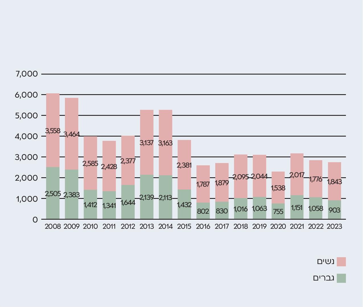 תרשים ה/5. מתגיירים במערכי הגיור הרשמיים, לפי מין, 2023-2008 (במספרים מוחלטים)