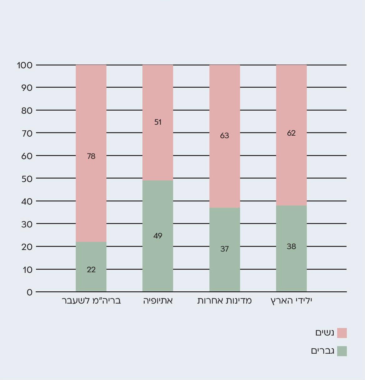 בקרב המתגיירים ילידי ברית המועצות לשעבר בולט שיעור גבוה מאוד של נשים מתוך המתגיירים — 78%; ואילו בקרב ילידי אתיופיה המתגיירים מתפלגים כמעט שווה בשווה בין גברים לנשים. בקרב המתגיירים ילידי הארץ ומדינות אחרות ניתן לראות רוב נשי למתגיירים (62% ו־63%, בהתאמה), אך בשיעור נמוך בהרבה מזה שבקרב המתגיירים ילידי ברית המועצות לשעבר.