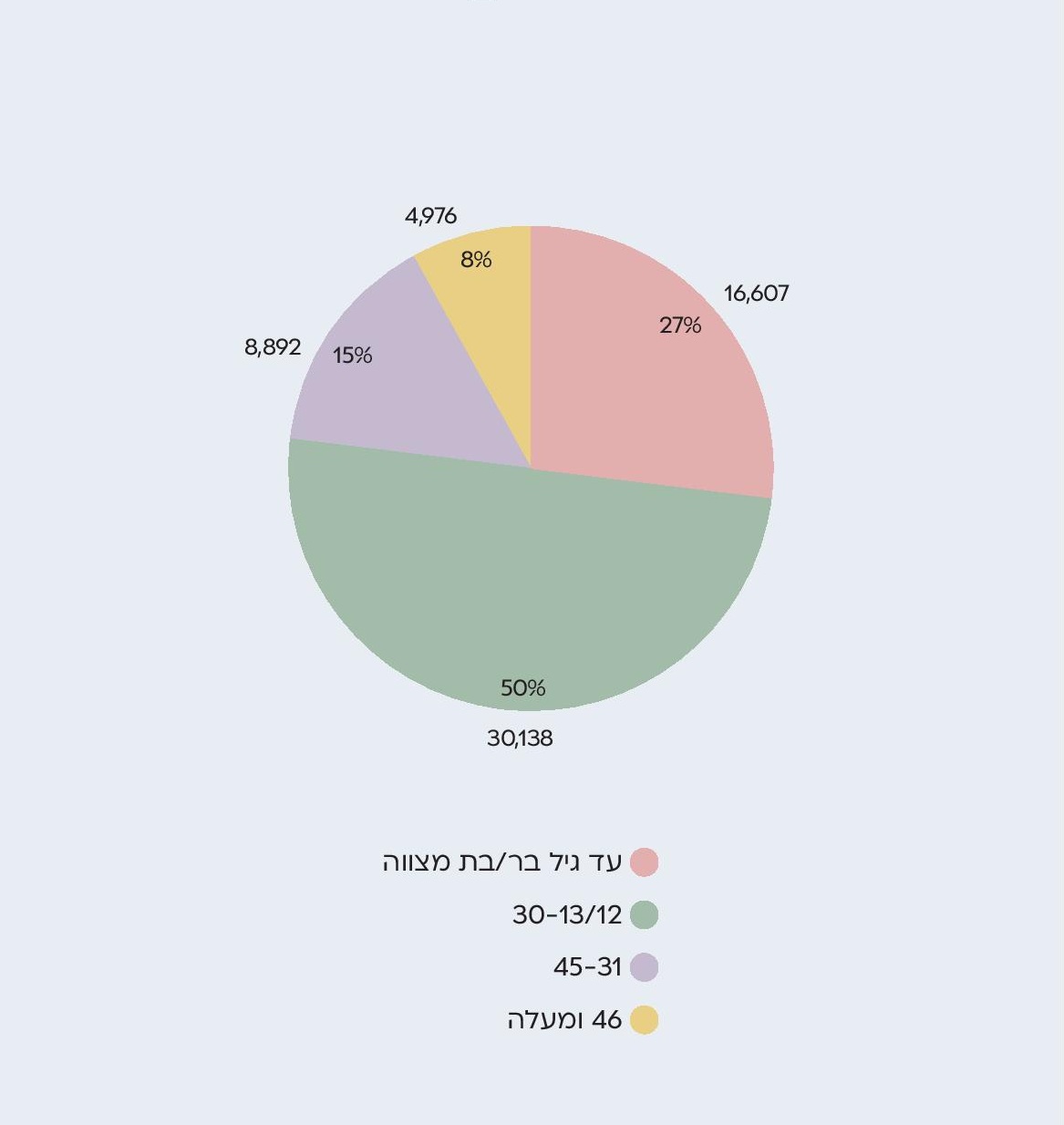 בתרשים הבא מוצגת התפלגות הגילים של המתגיירים בשנים 2023-2008. בהצגת הנתונים ייחדנו קטגוריה לילדים קטנים שלא הגיעו לגיל מצוות (גיל 12 לנשים וגיל 13 לגברים). ילדים אלו מוגדרים על פי ההלכה "קטנים", וגיורם נעשה לפי פרוצדורה הלכתית ייחודית. מכיוון שמבחינה הלכתית "קטן" אינו נחשב בר דעת ואין תוקף הלכתי למעשיו, גיורו נעשה על ידי בית דין, והוא מותנה בהחלטה סופית של ה"קטן" בהגיעו לבגרות.
