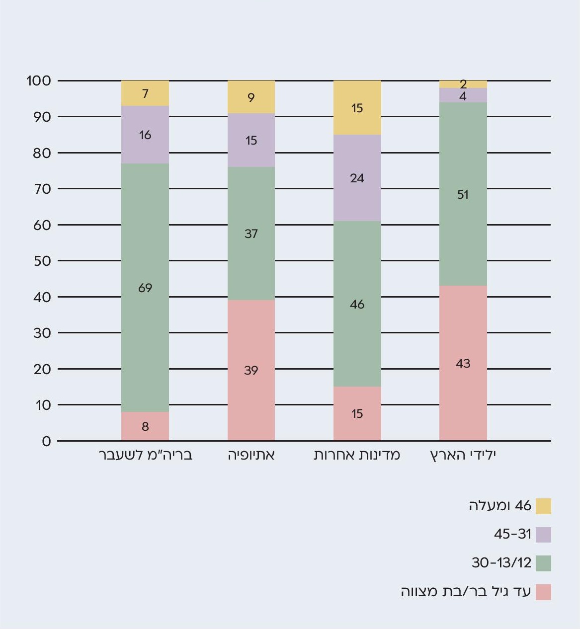 כרבע מהמתגיירים הם קטינים לפני גיל מצוות, ועוד כמחצית הם ילדים וצעירים בין גיל מצוות לגיל 30 (ובתוכם כלולים כל המתגיירים בצה"ל). עוד כרבע מהמתגיירים הם מעל גיל 30, רובם בגילי 45-31. השיעור הגבוה של מתגיירים מתחת לגיל 30 נשמר לאורך כל השנים: בשנת 2008 שיעור המתגיירים מתחת לגיל 30 עמד על 78%, ובשנת 2023 שיעור זה עמד על 75%. התרשים הבא מציג את שיעור המתגיירים לפי גיל ולפי ארץ לידה.