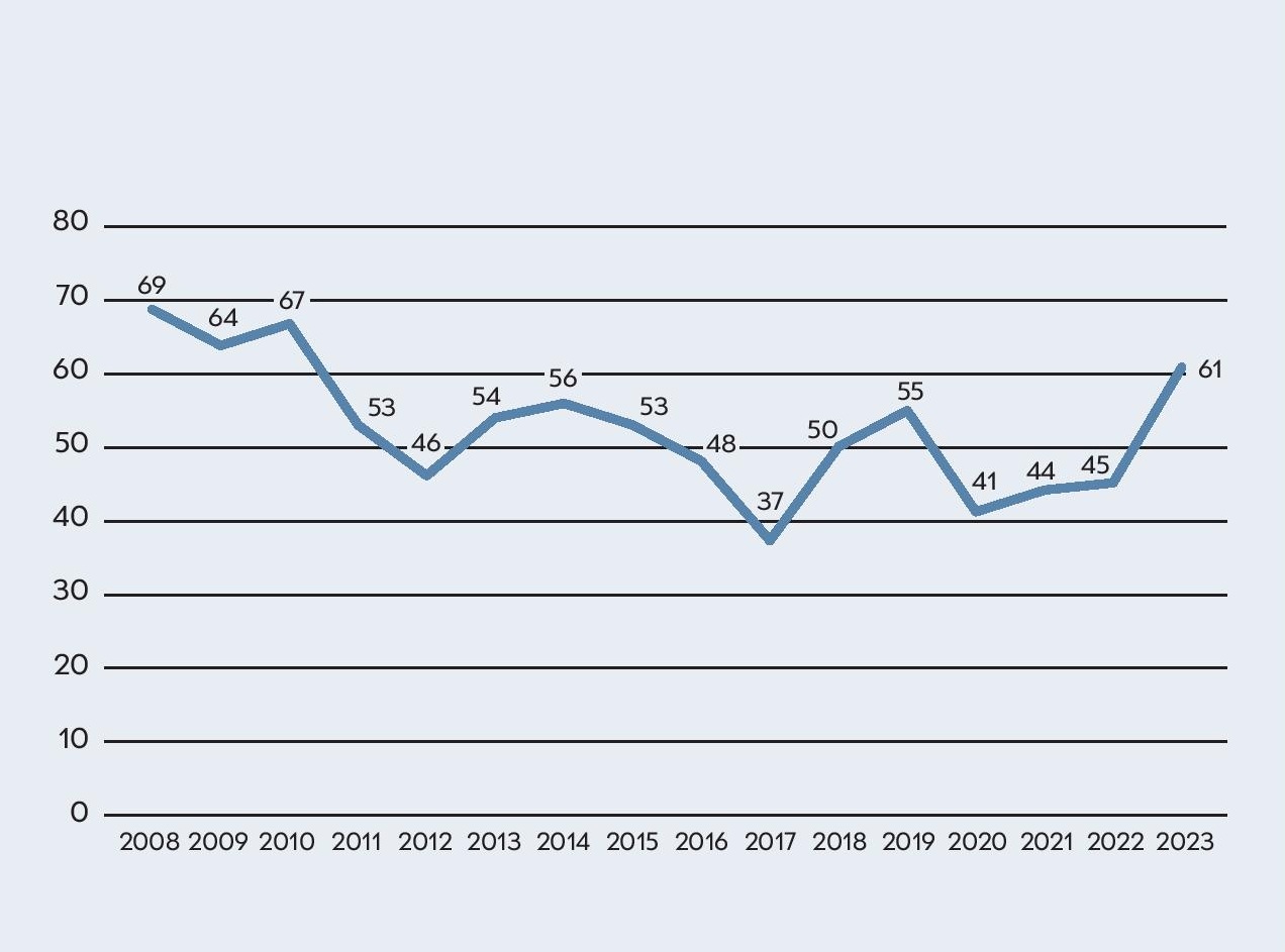 תרשים ה/9. היחס בין מספר הגיורים שנערכו למספר תיקי הגיור שנפתחו במערך הגיור בצה"ל, 2023-2008 (ב־%)