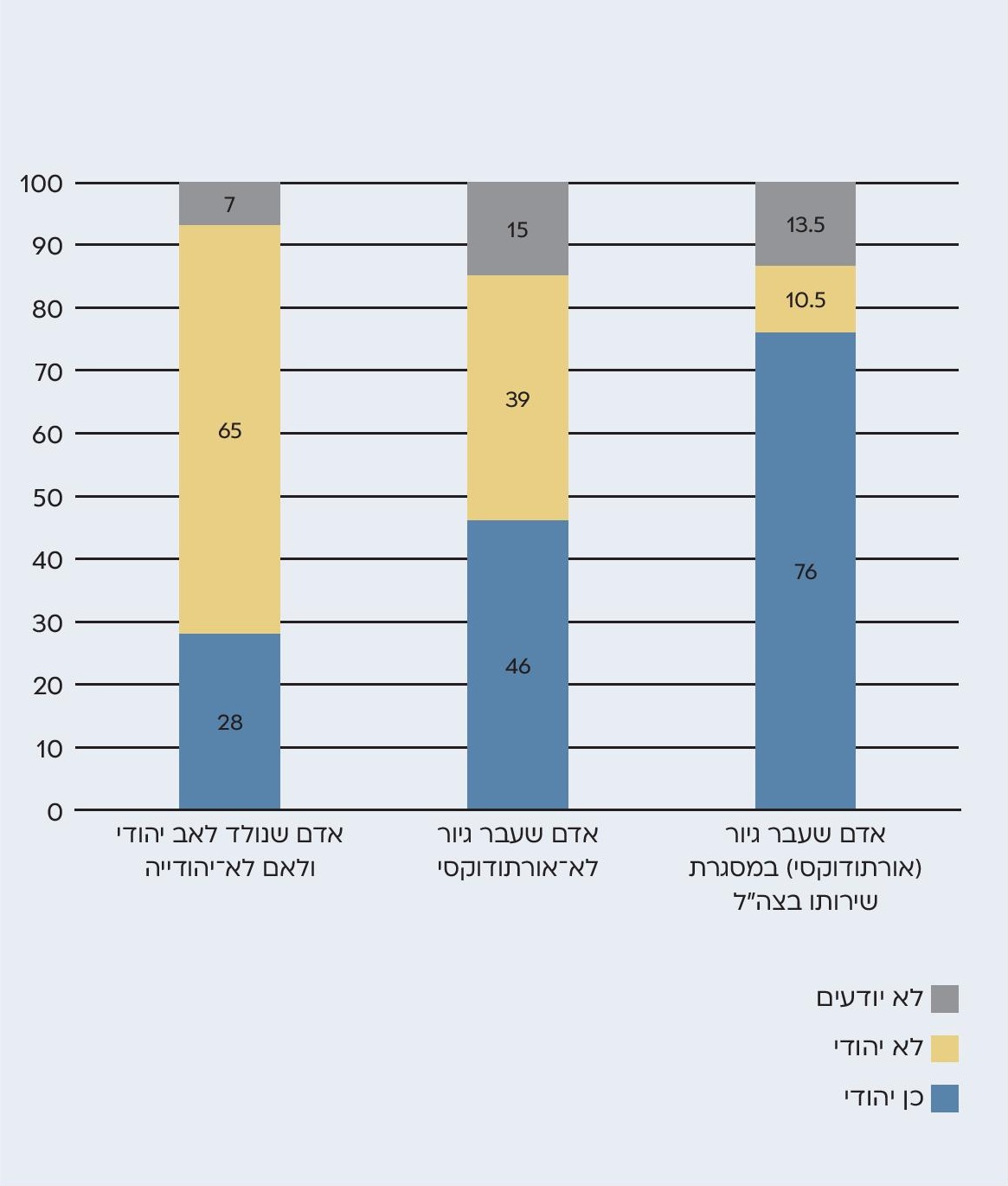 התרשים הבא בוחן את מידת ההכרה ביהדות של מי שנולד לאב יהודי ולאם לא־יהודייה, לפי הגדרה דתית.