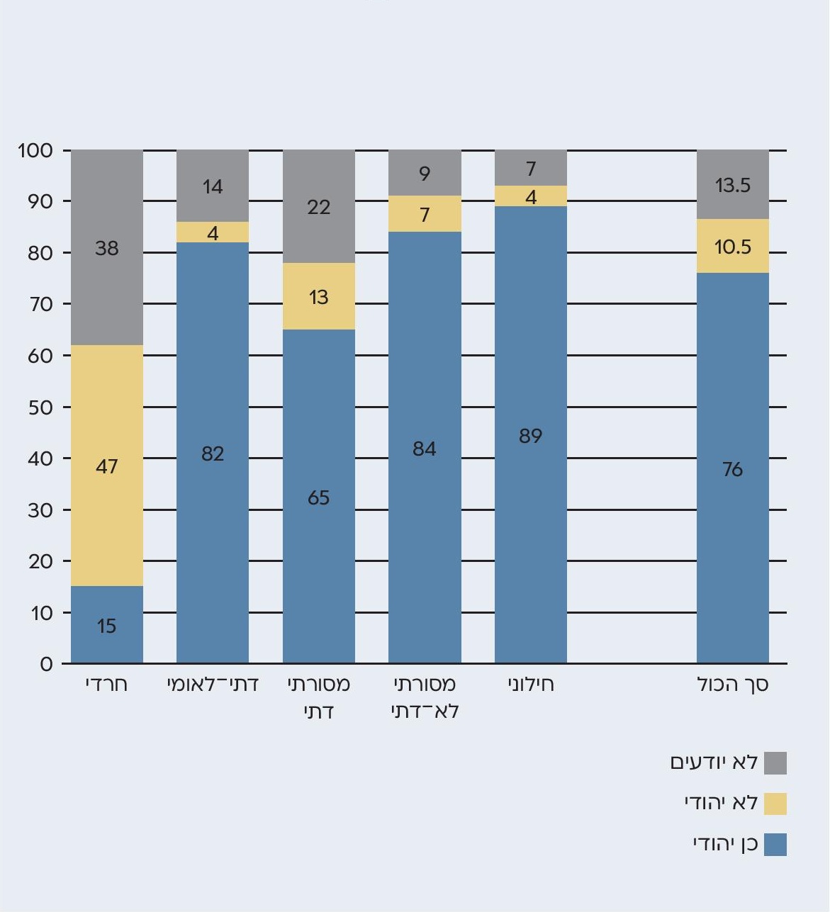 תרשים ה/13. האם איש או אישה בעל מאפיין זה הם יהודים בעיניך? (ב-%, מדגם יהודים)