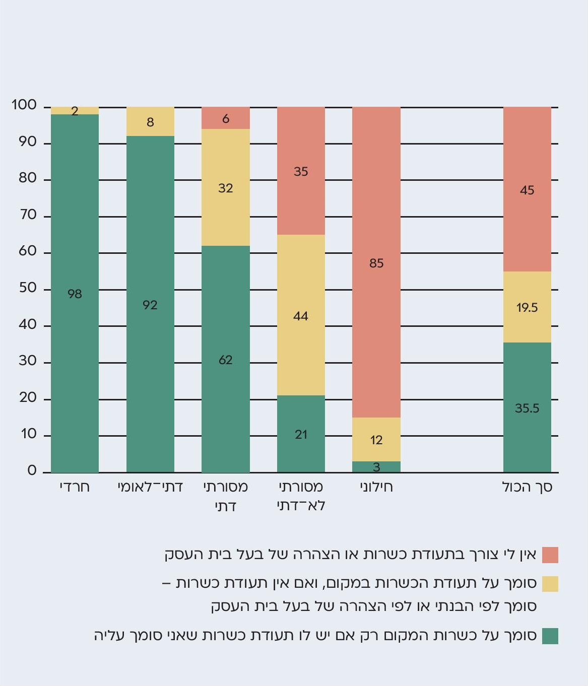 הערה: מספר החילונים המקפידים על אכילה במקום שיש בו תעודת כשרות הוא קטן מאוד. לפיכך פילוחם לתתי־קבוצות לא התאפשר במסגרת המדגם, אך נתוני הסך הכול בתרשים כוללים גם אותם. כך נהגנו גם בשני התרשימים הבאים.