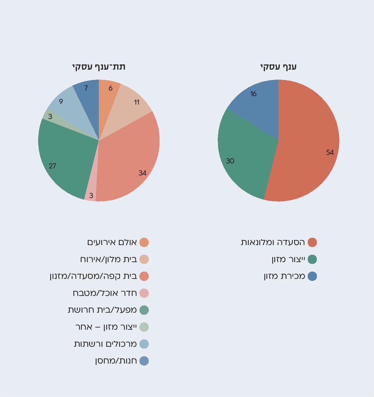 הענף העסקי הדומיננטי ביותר כשמדובר במספר שעות ההשגחה הוא ענף ההסעדה והמלונאות — 5 מיליון שעות השגחה, שהן 54% משעות ההשגחה. מתוך התתי־ענפים בולטים במיוחד בית קפה/מסעדה/מזנון (34%) ומפעל/בית חרושת (27%).
