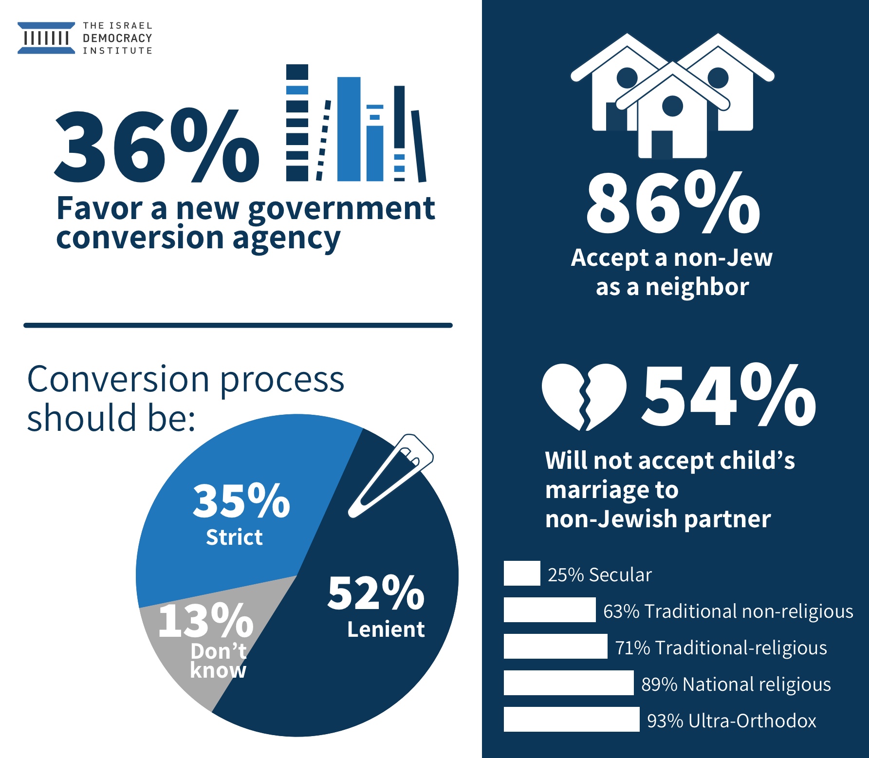 However, there is a large difference between different groups along the ultra-Orthodox---Secular spectrum: for all groups, except for secular Jews, the largest group (a majority among ultra-Orthodox – 73%, and Traditional-religious – 57.5%) believes that conversion means joining both the Jewish people and Jewish religion. Nevertheless, among secular Jews, the largest number answered that converts are only joining the Jewish religion.