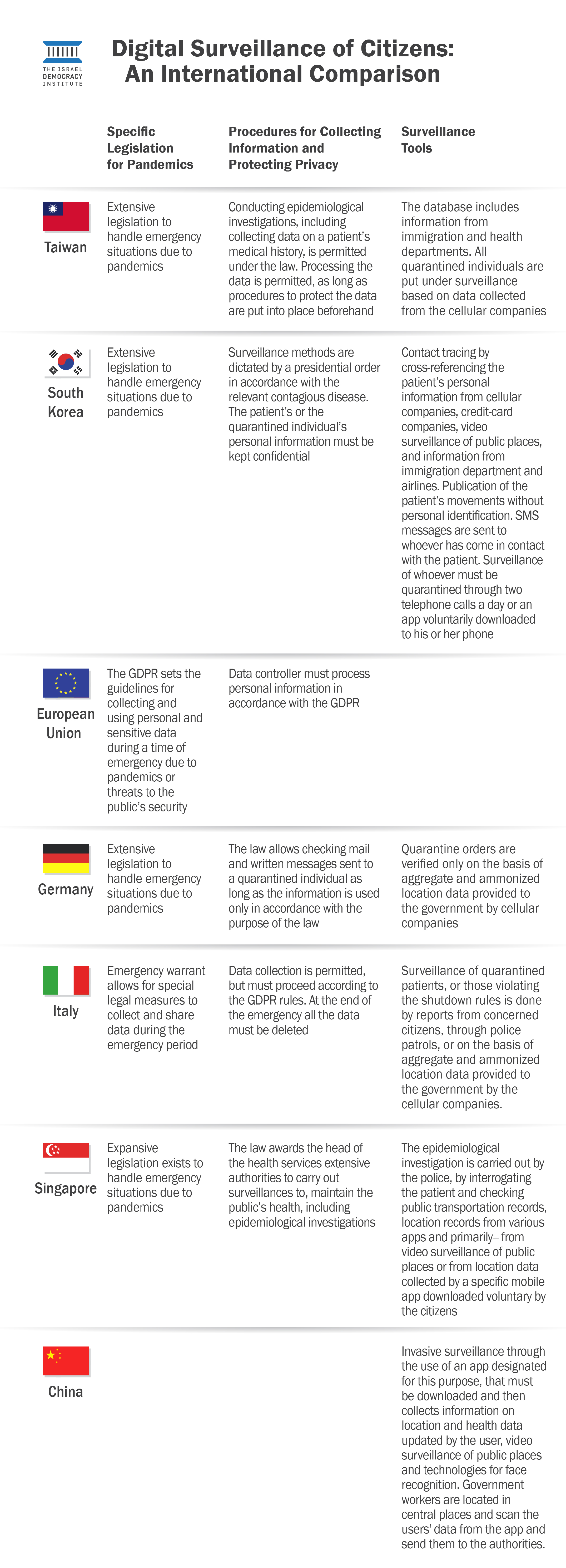 Israel has authorized its secret services to carry out extensive surveillance of civilians in the battle against the Coronavirus. In most other democracies there is dedicated legislation to deal with information gathering during the epidemic. IDI's experts complied a comparative review.