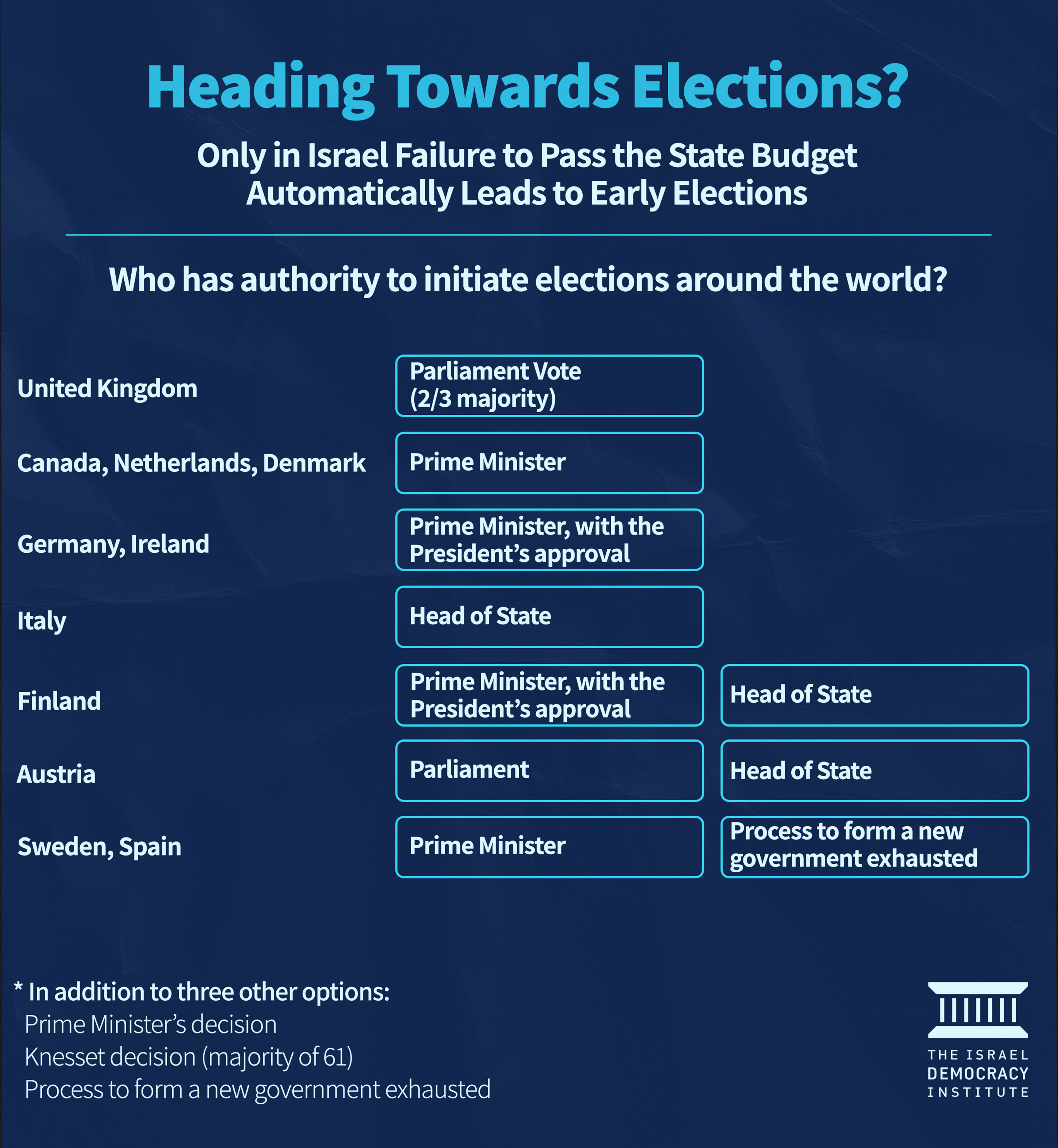 In Israel, there are several mechanisms for dissolving parliament, which are also accepted in many other democracies: dispersal by the prime minister with the consent of the president; dispersal based on a law to dissolve the Knesset; and dispersal resulting from the failure to form a government. However, the dissolution of the Knesset due to the inability to approve a government budget is a mechanism unique to Israel.