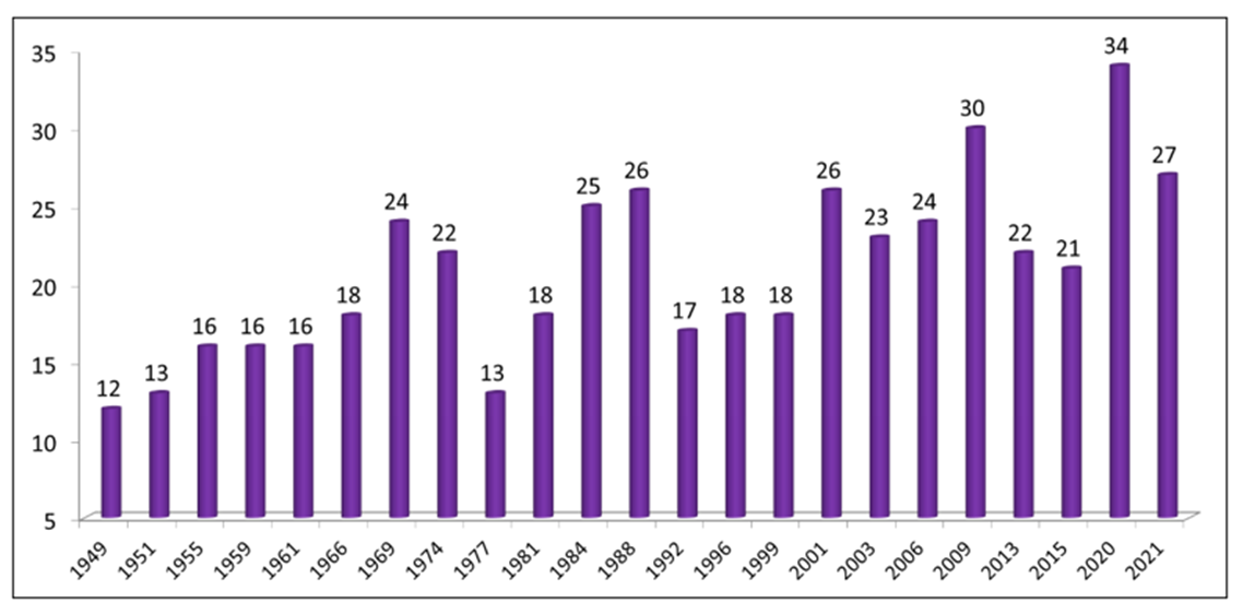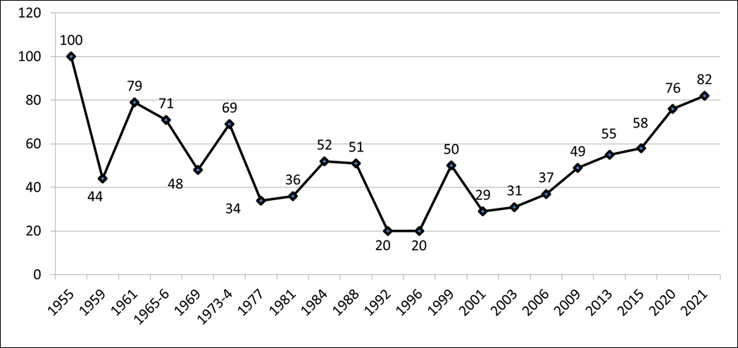 Figure 1 below shows that the process of forming a government during the first two decades of the State of Israel took longer than today, largely because in those days, the process was not limited in time. In 1955, no fewer than 100 days passed between the elections for the third Knesset and the swearing-in of the new government, and in 1961, it took 79 days from the elections for the fifth Knesset until the new government was sworn in. Subsequently, the time taken became much shorter, but since 2001, these periods have become longer again. It should be noted that the numbers given are the “gross” number of days, that is, the time that passed between election day and the swearing-in of the government. If we subtract the number of days between the elections and the time at which the President formally charged a particular candidate with the task of forming a government, then these periods are a bit shorter.