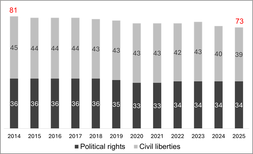 Israel’s score in the Freedom in the World index, 2014–2025
