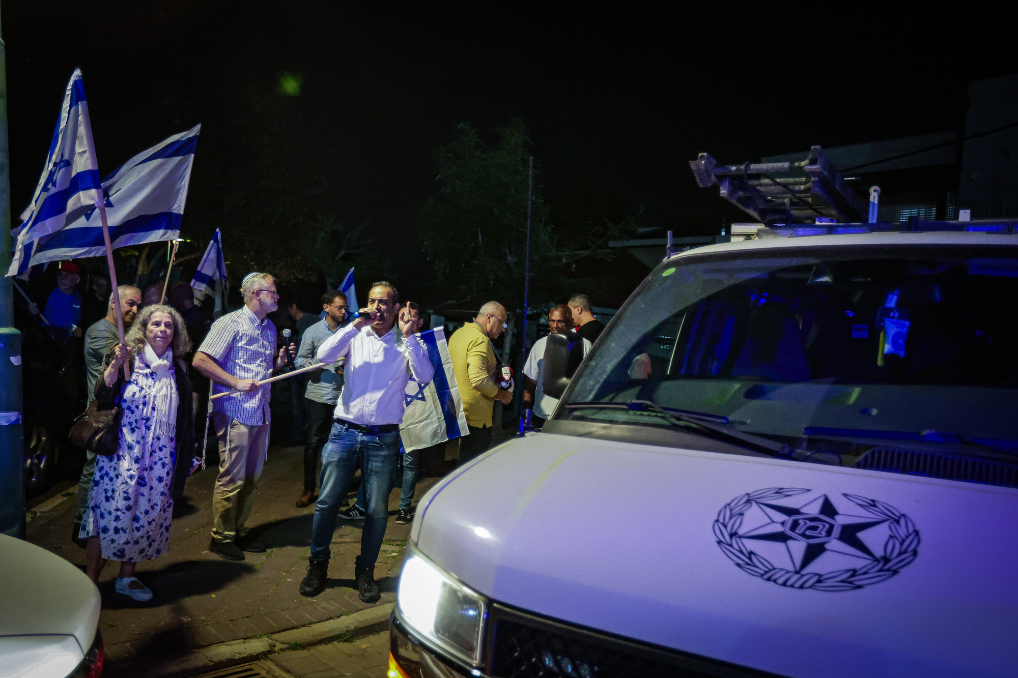 Activists protest against Former Director of the Shin Bet Nadav Argaman outside his home in Herzliya, March 16, 2025. Photo by Tal Gal/Flash90