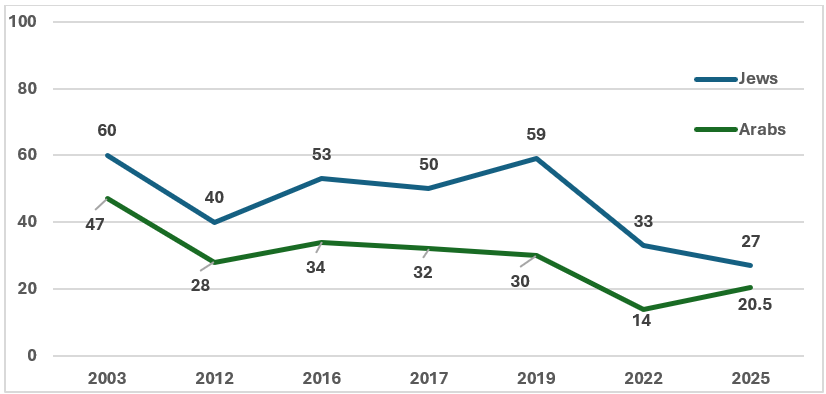 We asked our respondents to what extent they agree or disagree with the following statement: “It makes no difference who you vote for; it doesn’t change the situation.” This question has already been asked 13 times in Democracy Index surveys. In the 2025 survey, 40% of the total sample agreed with this statement and 56% disagreed with it. Among Jews, a much larger share of respondents disagree than agree, but Arab respondents are almost evenly divided between the two opposing views.