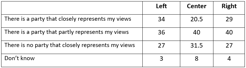 Breaking down responses in the Jewish sample by political orientation reveals that the Center has the smallest share of respondents who feel that there is a party that closely represents their views, while the Left has the largest, and the Right is somewhere in between.
