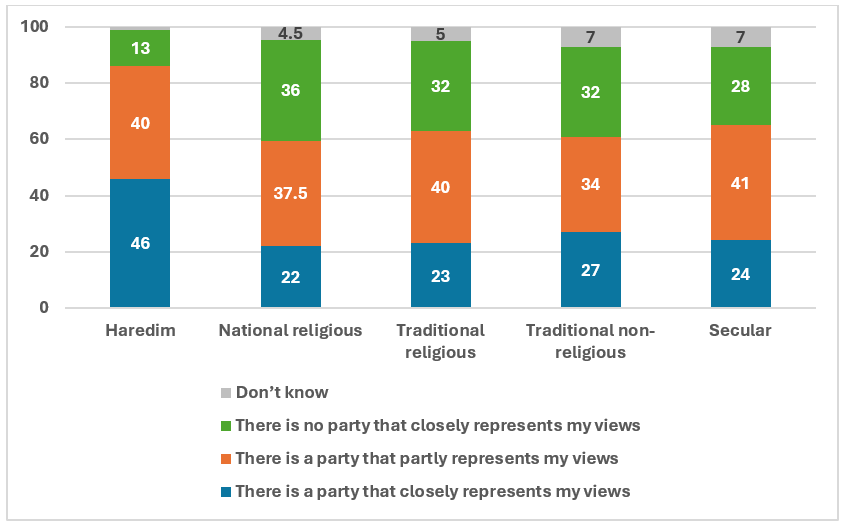 Segmentation of the Jewish sample by religiosity shows that the ultra-Orthodox (Haredim) feel the most represented by some party or other, while the national religious group has the highest percentage who feel that there is no party that represents them well. With the exception of the Haredim, the largest share of respondents in all groups say that there is a party that partly represents their views.