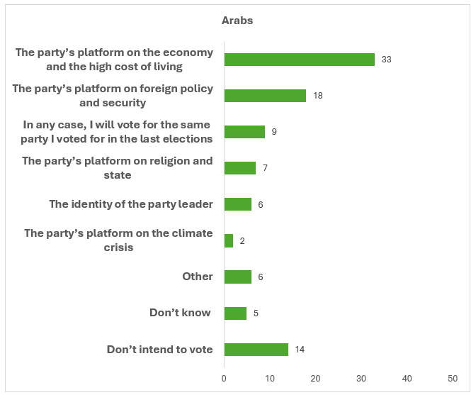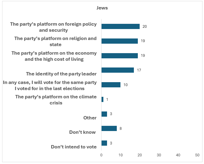 On the Left (Jewish sample), the largest share of respondents say that the most decisive factor is the party’s platform on issues of religion and state (24%). Respondents in the Center reported that the party’s platform on the economy and the cost of living (25%) is the most important factor for them when deciding which party to vote for, while for those on the Right, the factor that most strongly influences their decision is the party’s platform on foreign policy and security (22%).