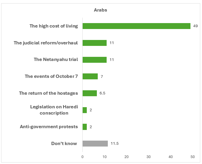 On this question as well, the largest share of Arab respondents (49%) reported that the cost of living is the most important issue for them when deciding who to vote for. Among Jews, five issues/events were selected by very close (16-18%) shares of respondents as the dominant factors in determining which party they would vote for: the return of the hostages, the events of October 7, legislation on Haredi conscription, the high cost of living, and the judicial reform/overhaul.