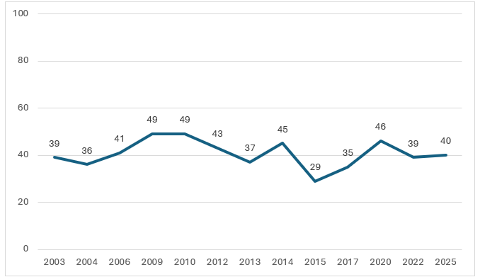 Agree that there is a political party in Israel that closely represents their views, 2003–2025 (%)