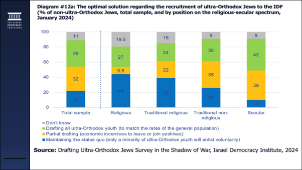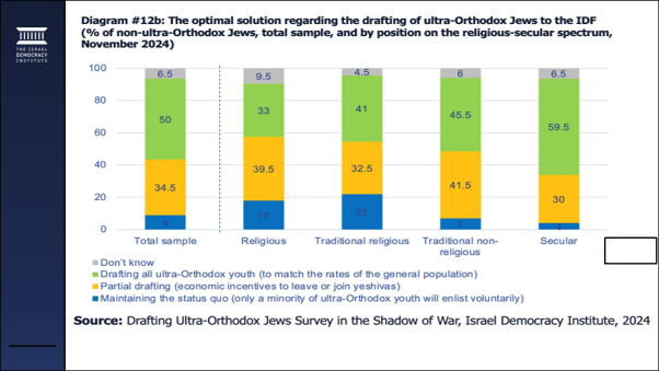 What is the correct solution for ultra-Orthodox conscription into the IDF? According to religious affiliation (% of non-Haredi-Jews; November 2024)