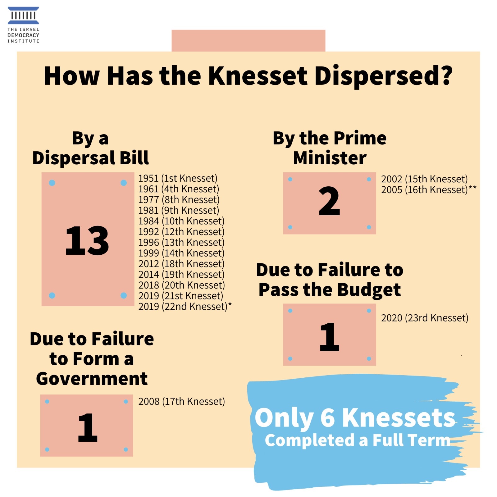 | By a Law to Dissolve the Knesset | Dissolved by the Prime Minister | Dissolved automatically when a new Government was not formed | Due to failure to pass the State Budget |