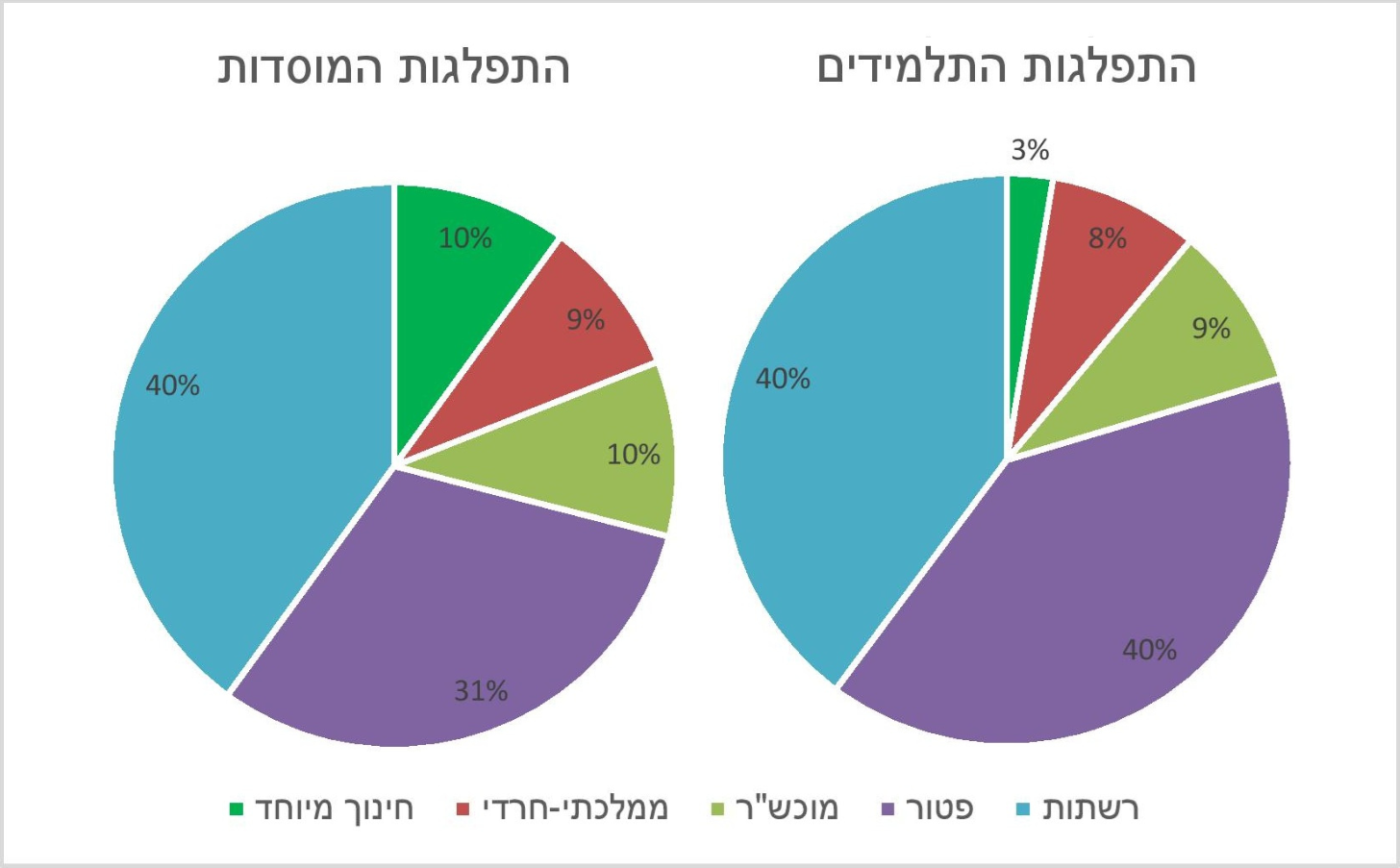 ניתן לראות שמרבית התלמידים הבנים בחינוך החרדי היסודי לומדים במוסדות פטור (40%) וברשתות (40%). בשנים קודמות התמונה הייתה דומה למדי, אך החינוך הממלכתי-חרדי היה קטן יותר, ולכן שיעור התלמידים במוסדות הפטור, הרשתות והמוכש"ר היה מעט גבוה יותר.