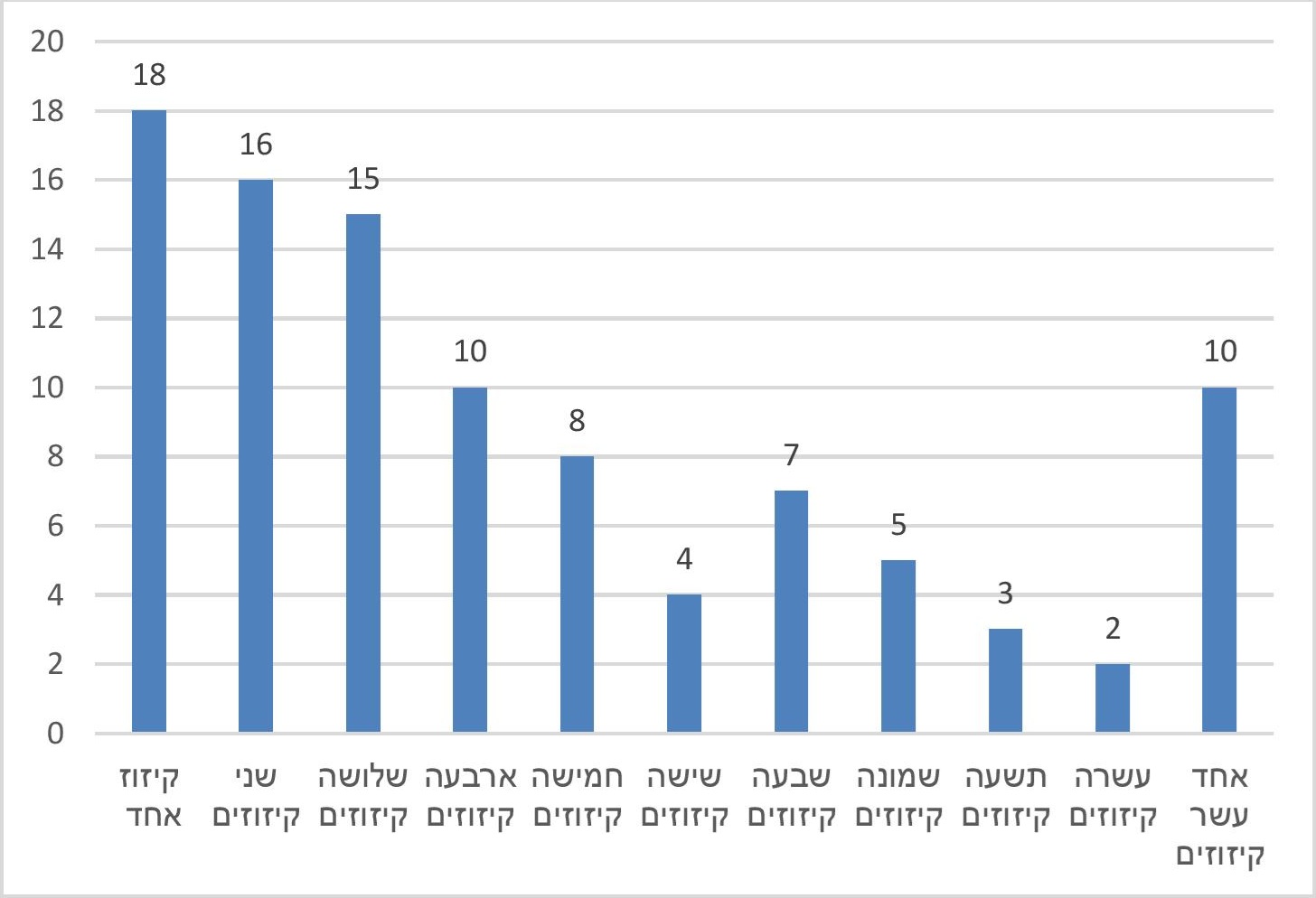 במרבית מוסדות החינוך שהמשרד קיזז מתקציבם לא היה מדובר בתופעה חד-פעמית בשנה אחת, אלא בתופעה המתמשכת על פני כמה שנים. כך, לאורך השנים תשע"ד-תשפ"ד נערכו בסך הכול 445 קיזוזים, ב-98 מוסדות. להלן מוצג מספר הקיזוזים שנערכו למוסדות השונים.