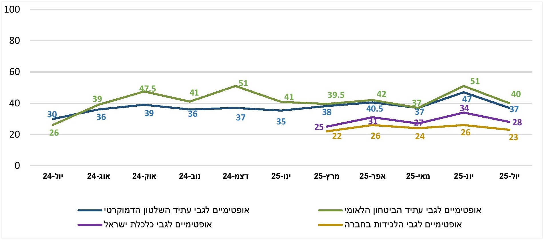 • בהשוואה ליוני, החודש נמדדה ירידה בשיעורי האופטימיים בארבעת מדדי מצב הרוח, שהיא בעצם חזרה לנתוני החודשים הקודמים. בכל המדדים (עתיד הביטחון, עתיד הדמוקרטיה, עתיד הכלכלה ועתיד הלכידות החברתיות) מדובר רק במיעוט של אופטימיים.