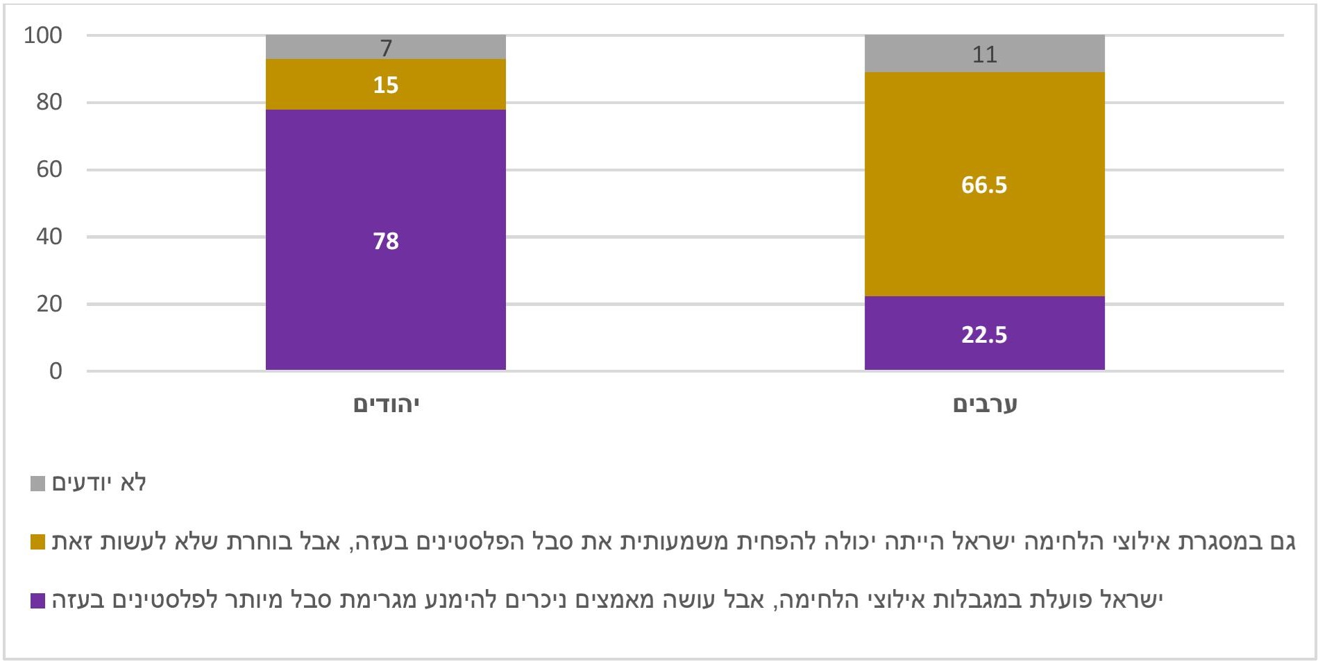 • רוב המרואיינים היהודים סבורים שבנסיבות הלחימה ישראל עושה מאמצים להימנע מגרימת סבל לפלסטינים בעזה. רוב המרואיינים הערבים חושבים שגם בנסיבות לחימה ישראל הייתה יכולה לעשות יותר מאמצים להקטנת הסבל הזה. רק בשמאל הרוב סבורים כי ישראל אינה עושה את המאמצים הדרושים להקטנת הסבל.
