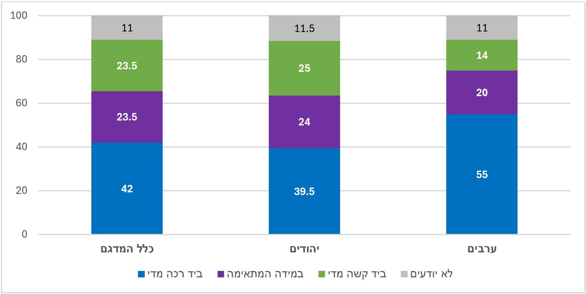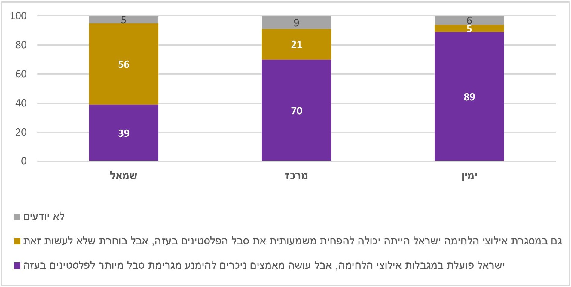 • במישור האישי הרוב במרכז ובימין (יהודים) השיבו אינם מוטרדים מהרעב והסבל של הפלסטינים בעזה. בשמאל הרוב דיווחו שהם מוטרדים אישית מכך.