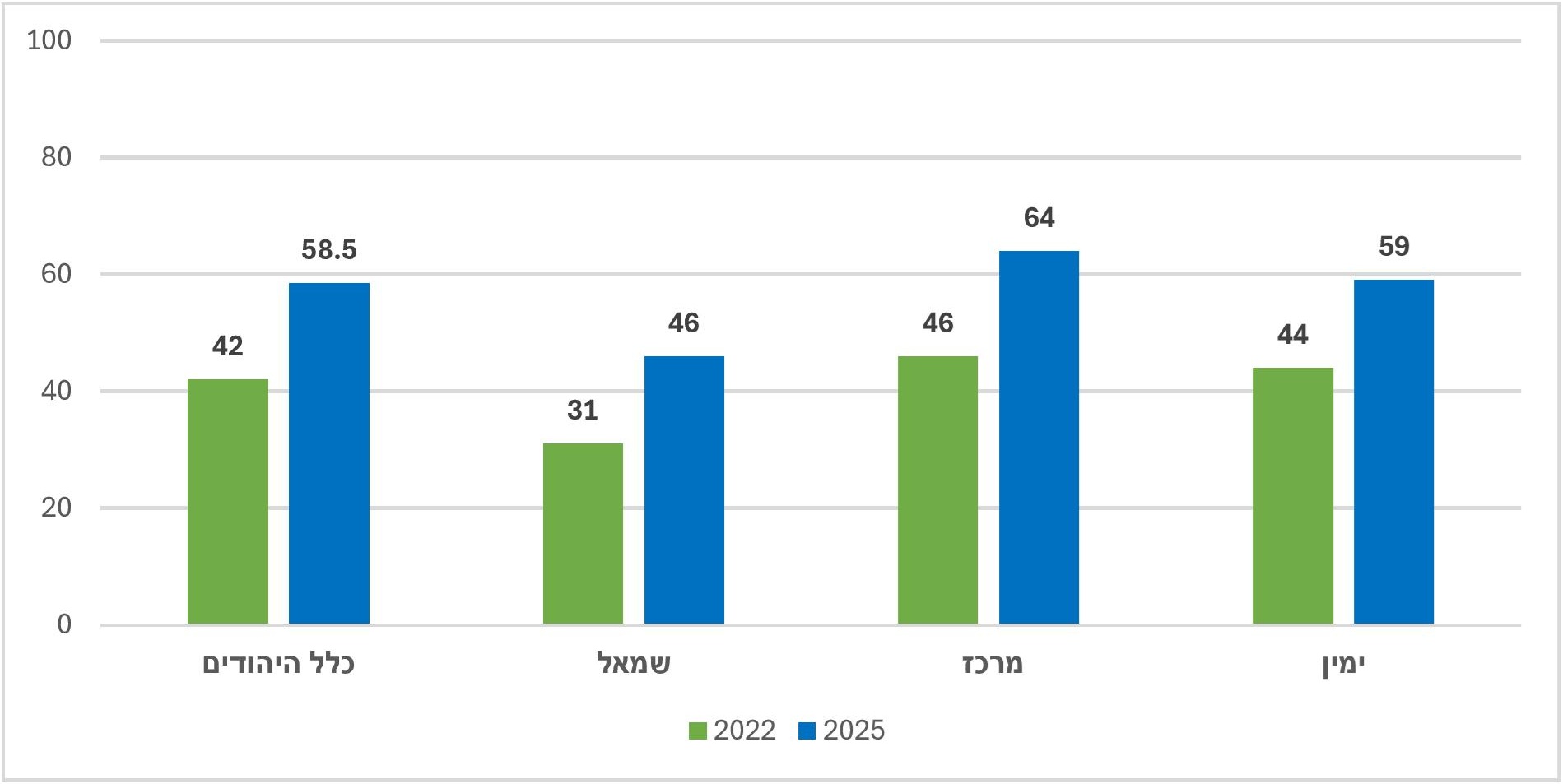 השווינו את התשובות הפעם לתשובות לשאלה דומה שנשאלה ב-2022 ואף פילחנו את מדגם היהודים לפי מחנות פוליטיים. בקרב כלל היהודים כמו גם בשלושת המחנות נרשמה עלייה ניכרת בשיעור המאמינים לדיווחי צה"ל בנושא. עם זאת שיעור אלו שאינם מאמינים לדיווחי צה"ל בנושא לא ירד. העלייה בשיעורי האמון בדיווחי צה"ל קשורה לירידה בשיעור אלו שהשיבו שאינם יודעים אשר שיעורם ירד מ-19% ב-2022 ל-6% ב-2025.