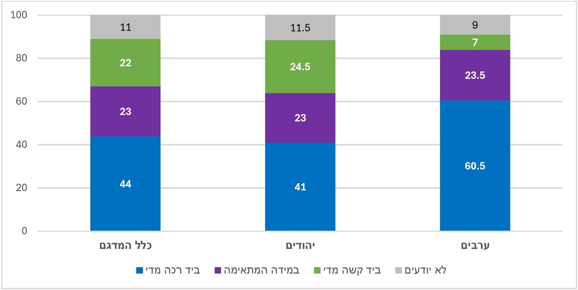 בקרב היהודים ההתפלגות דומה מאוד להתפלגות המדגם הכללי, ואילו בקרב הערבים שיעור הגורסים שהרשויות נוקטות יד רכה מדי גבוה משמעותית.