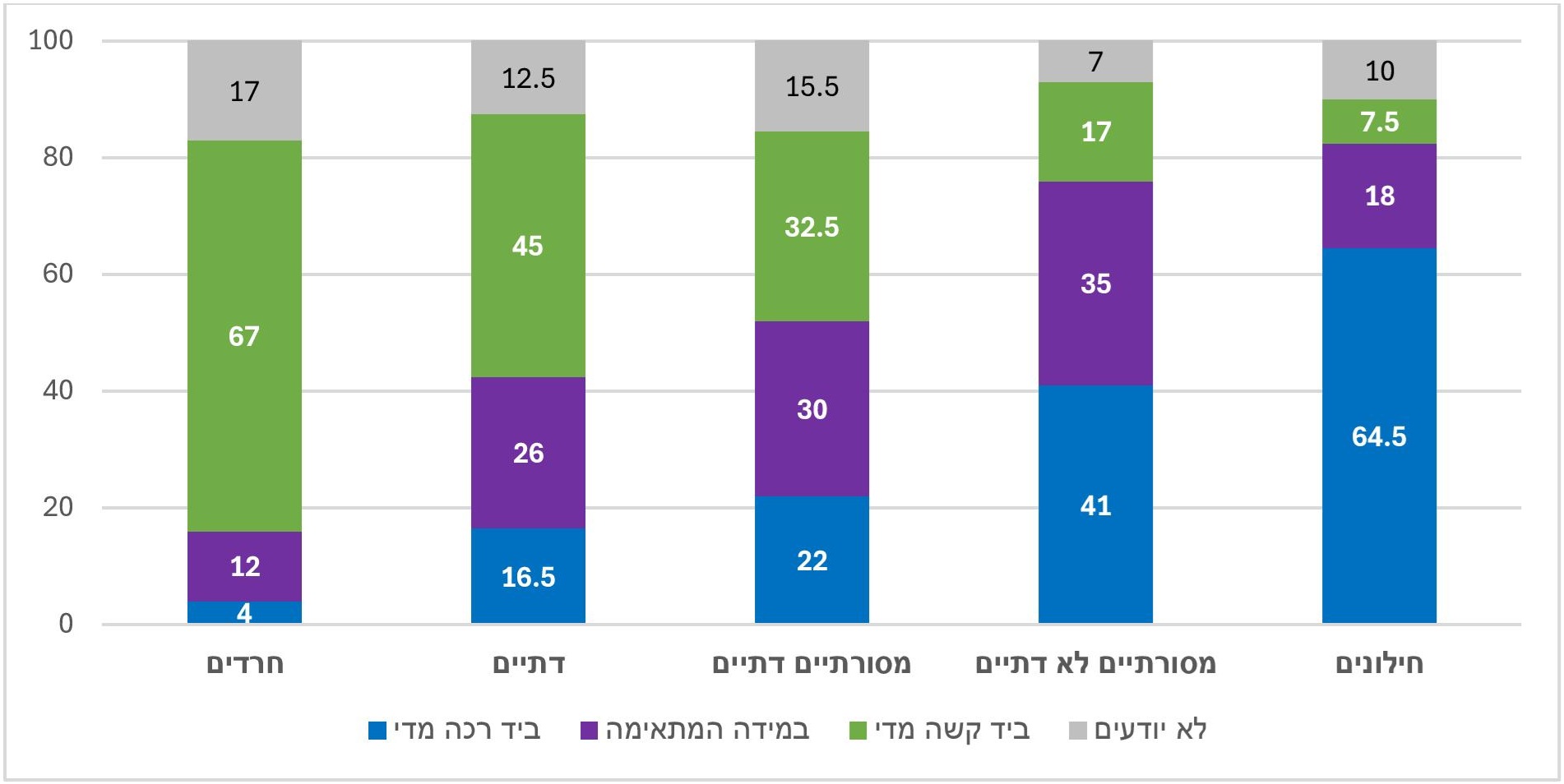 פילוח לפי מיקום על הרצף חרדים-חילונים מציב שוב את החרדים והחילונים בקצוות: מחצית מהחרדים סבורים שהתגובה של הרשויות קשה מדי ואילו בקרב החילונים שיעור קצת גבוה יותר חושבים שהרשויות נוקטות יד רכה מדי. יתר הקבוצות נמצאות בתווך. ראוי לשים לב להבדל בתוך קבוצת החרדים: שיעורם של אלה הרואים את התגובה נגד מתנחלים הפוגעים בצה"ל כקשה מדי (67%) גבוה משמעותית משיעור אלה החושבים שהתגובה נגד מתנחלים הפוגעים בפלסטינים היא קשה מדי (50%).