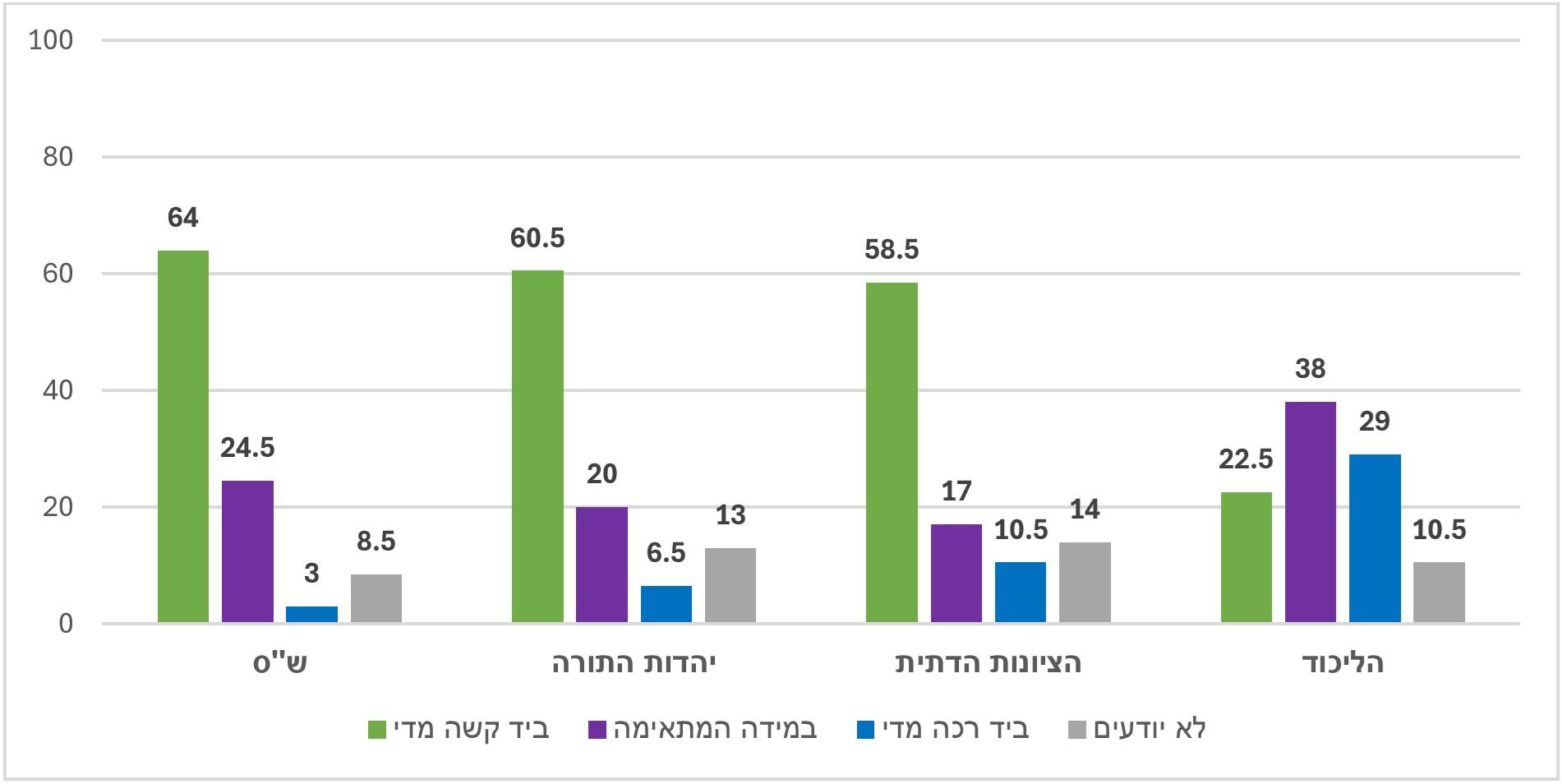 אלימות כלפי צה"ל וכוחות הביטחון – לאחרונה התרבו אירועי אלימות של קבוצות מתנחלים כלפי צה"ל וכוחות הביטחון בגדה המערבית/יהודה ושומרון. שאלנו: "לדעתך, האם כוחות הביטחון ורשויות האכיפה פועלים כלפי מתנחלים אלו ביד קשה מדי, ביד רכה מדי או במידה המתאימה?". קרוב למחצית מכלל הציבור סבורים שכוחות הביטחון נוקטים יד רכה מדי כלפי אלימות המתנחלים, קרוב לרבע חושבים שהאכיפה היא מתאימה ושיעור דומה שנוקטים כלפי המתנחלים האלימים יד קשה מדי.