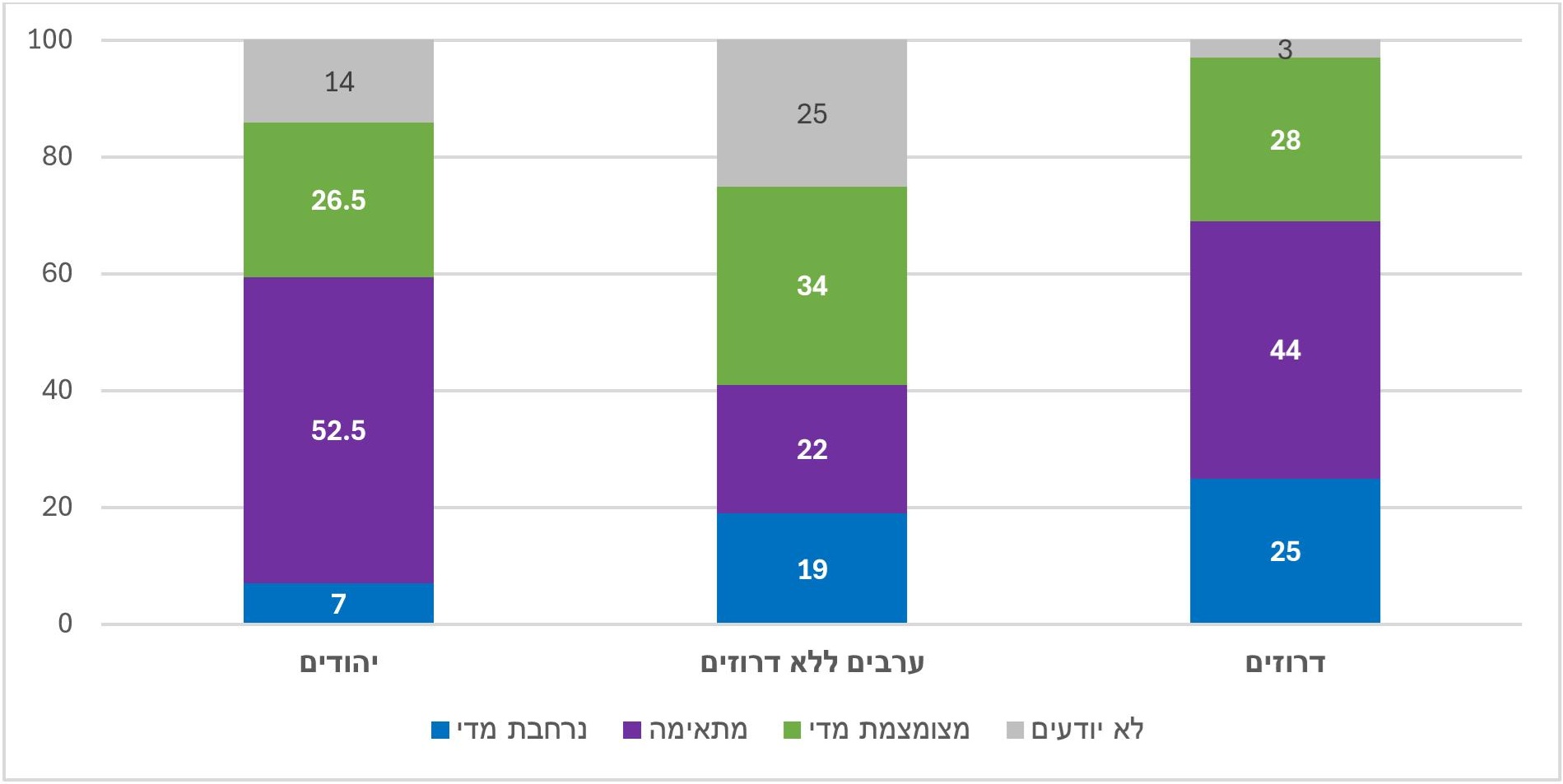 במסגרת "ברית הדמים" עם העדה הדרוזית בארץ, ישראל הבטיחה להגן על הדרוזים בסוריה. האם התגובה הישראלית בסוריה עקב הפגיעה בדרוזים שם הייתה נרחבת מדי, מצומצמת מדי או מתאימה? (%)