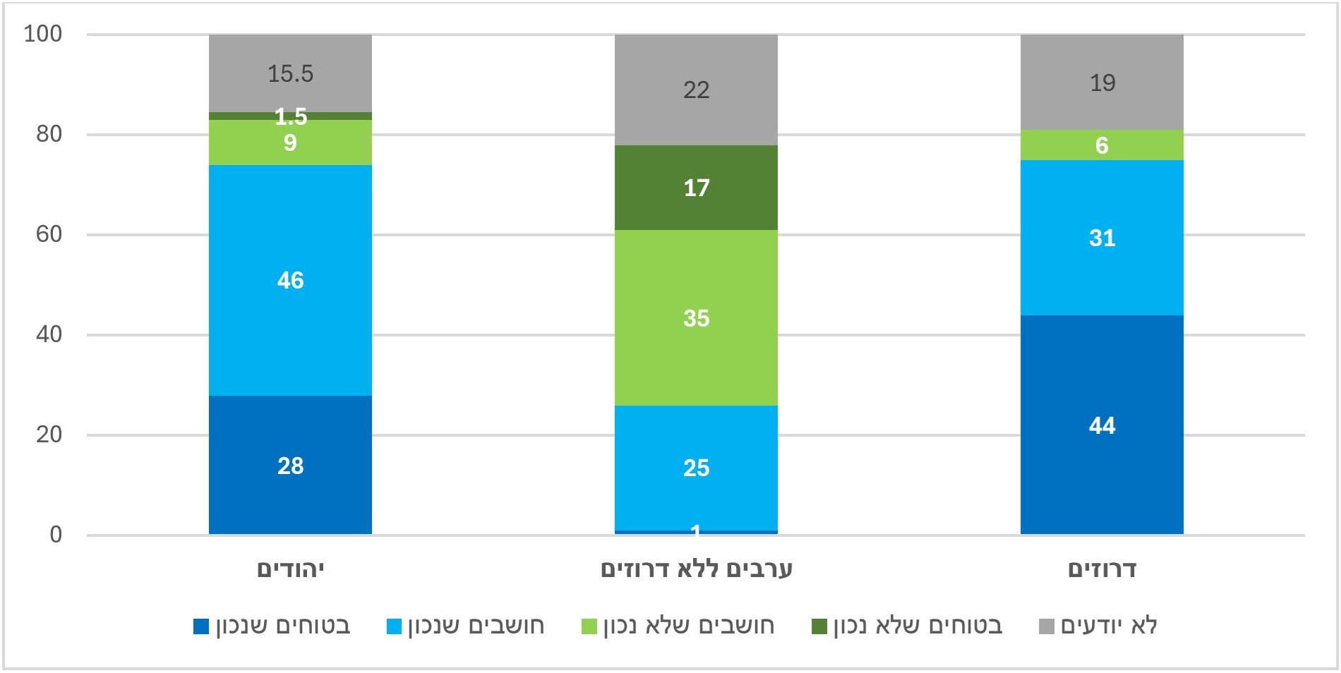 • נוכח "ברית הדמים" בין היהודים לדרוזים כמחצית מהיהודים ומהדרוזים סבורים שהתגובה הישראלית להגנה על הדרוזים בסוריה הייתה מידתית, כרבע חושבים שהיא הייתה מצומצמת מדי.