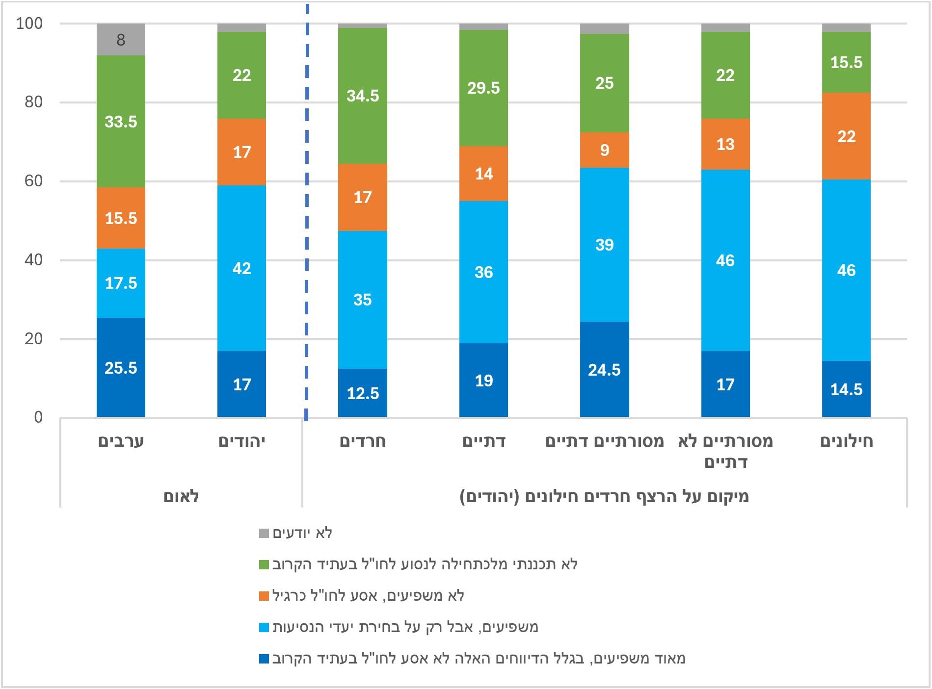 פילוח לפי מיקום על הרצף חרדים-חילונים (יהודים) מעלה שבכל הקבוצות שיעורים של בין שליש לחצי מהמשיבים מדווחים על השפעה על יעדי הנסיעה ועל שיעורים של בין 12.5% ל-24.5% שאינם מתכננים לנסוע בעקבות התגברות האנטישמיות וההתנכלויות לישראלים. כשמסירים את אלו שממילא לא תכננו לנסוע השיעורים קופצים: 84% מהמסורתיים הדתיים, 81% מהמסורתיים הלא-דתיים, 78% מהדתיים, ו-72% מהחילונים ומהחרדים מעידים שהאירועים משפיעים על החלטתם – אם בבחירת היעד אם בקיום הנסיעה.