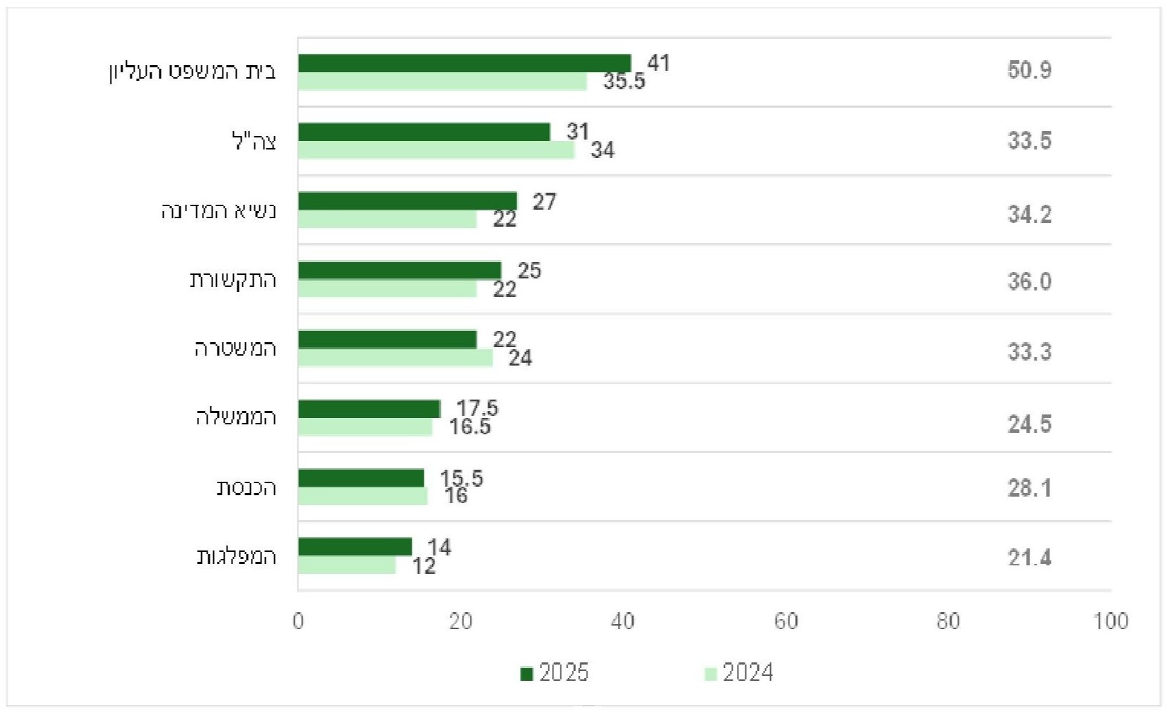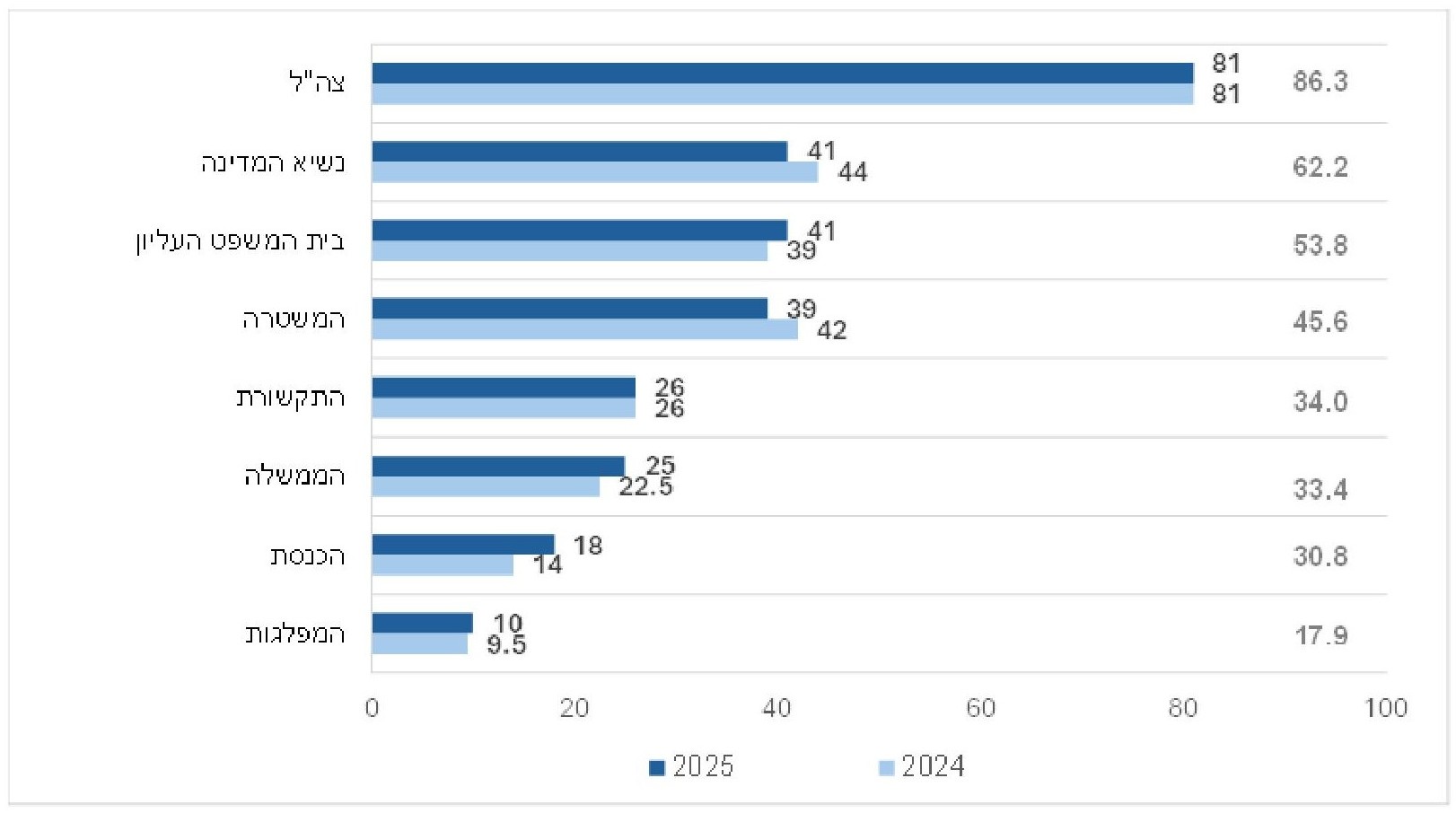 בשני המדגמים (יהודים וערבים) מדרג האמון ב-2025 דומה למדרג ב-2024. ברוב המקרים, שיעור נותני האמון השנה נמוך מהממוצע הרב-שנתי. בקרב היהודים (ובכל המחנות הפוליטיים) צה"ל ניצב בראש. אצל הערבים – בית המשפט העליון.