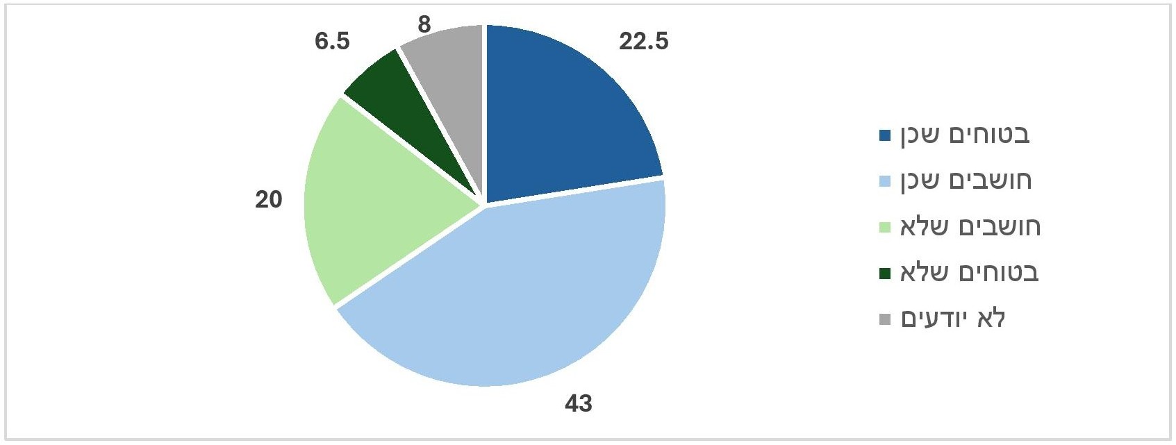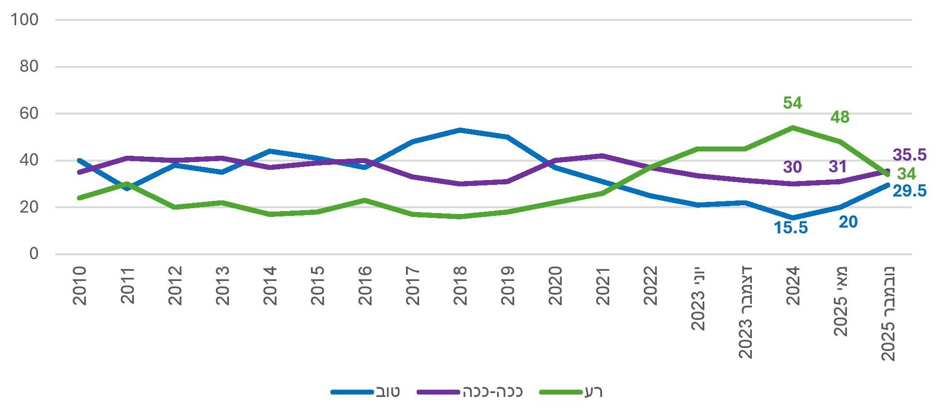 בנובמבר 2025 הישראלים נחלקים כמעט שווה בשווה בין המעריכים את מצבה של ישראל כטוב, ככה־ככה ורע. מדובר בשיפור משמעותי בהשוואה ל־2024 ולמאי 2025, אז כחצי מהישראלים הגדירו את מצבה של ישראל כרע או רע מאוד.
