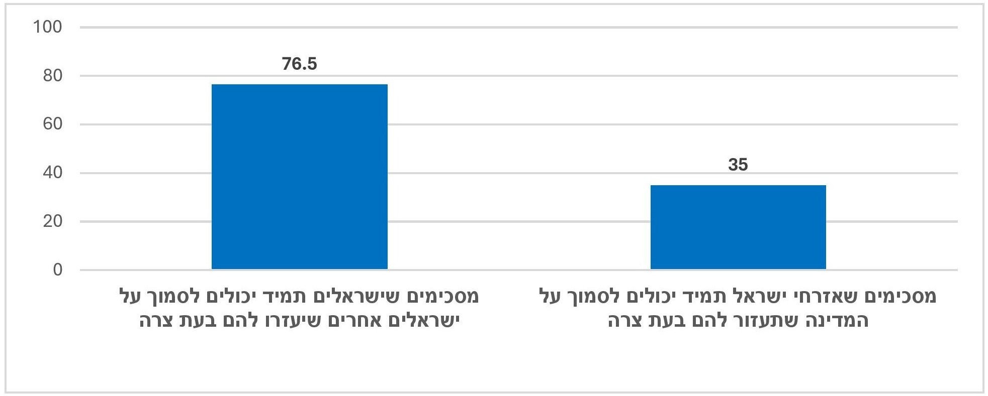 הן בקרב היהודים הן בקרב הערבים רוב גדול סבורים שאפשר תמיד לסמוך על ישראלים אחרים בעת צרה. עם זאת, רק כשליש מכלל המרואיינים הסכימו עם ההיגד שאזרחי ישראל יכולים תמיד לסמוך על המדינה שתעזור להם בעת צרה.