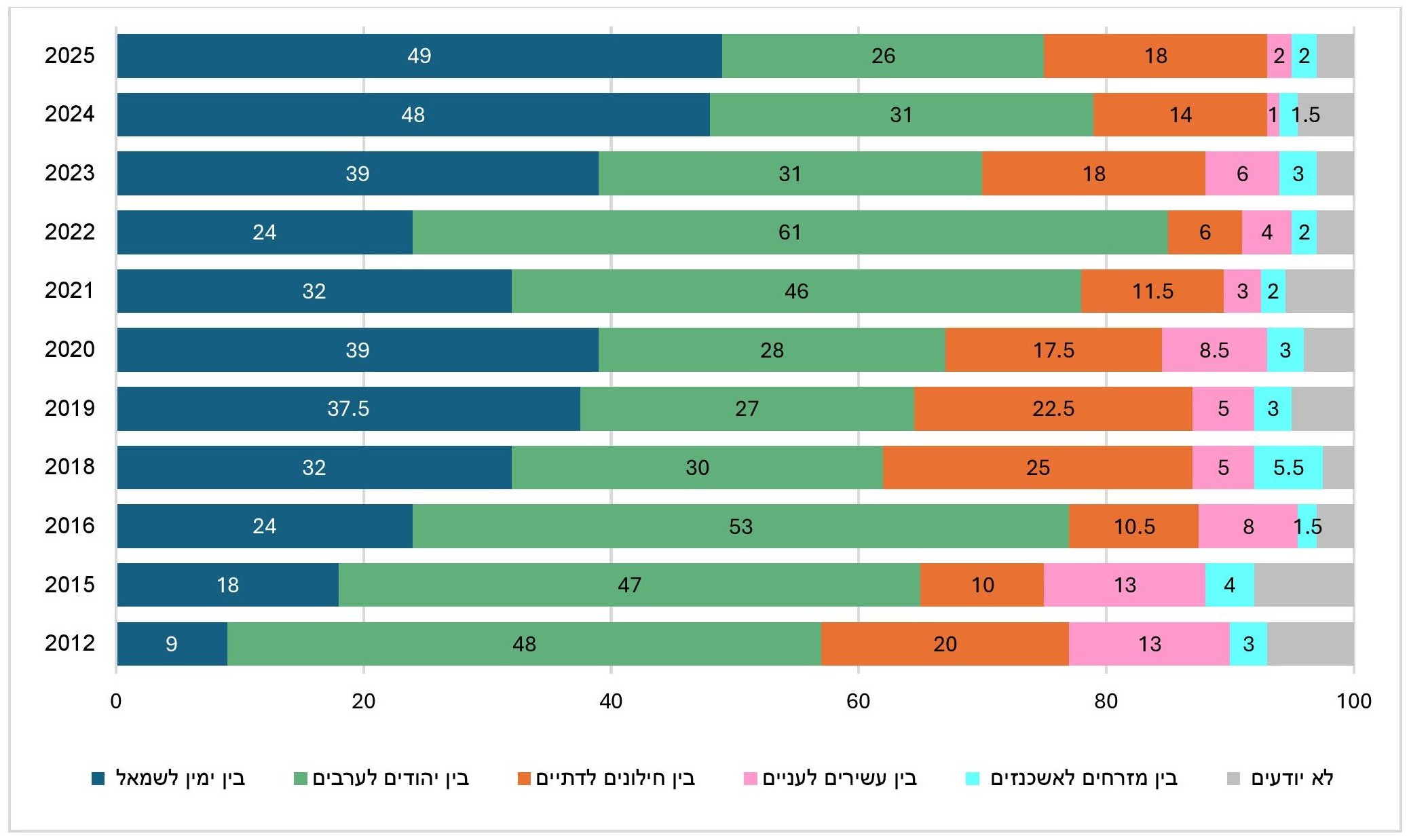 השיעור הגבוה ביותר (כמעט מחצית) בקרב הישראלים מדרגים את המתח בין ימין לשמאל כמתח המרכזי בחברה. בקרב היהודים מעל מחצית מעריכים את המתח הזה החזק ביותר, ובמקום השני נמצאים שני מתחים: המתח בין יהודים לערבים והמתח בין דתיים לחילונים. לעומת זאת, בקרב הערבים המתח בין יהודים לערבים נתפס כחזק ביותר, והמתח בין המחנות הפוליטיים מדורג במקום השני.