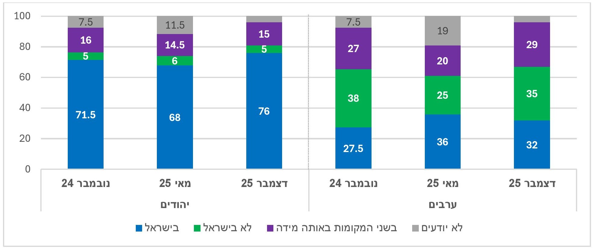 - בקרב הערבים התמונה שונה מאוד: רק כשליש מהנשאלים גורסים שבטוח יותר לערבים לחיות בישראל, מעט פחות משיעור הסבורים שבטוח יותר לחיות מחוץ לישראל, ומעט יותר משיעור החושבים ששני המקומות בטוחים באותה מידה. שיעור הסבורים שבטוח יותר לחיות בישראל מעט נמוך יותר בהשוואה למדידת מאי 2025 ומעט גבוה יותר מהשיעור בנובמבר 2024.