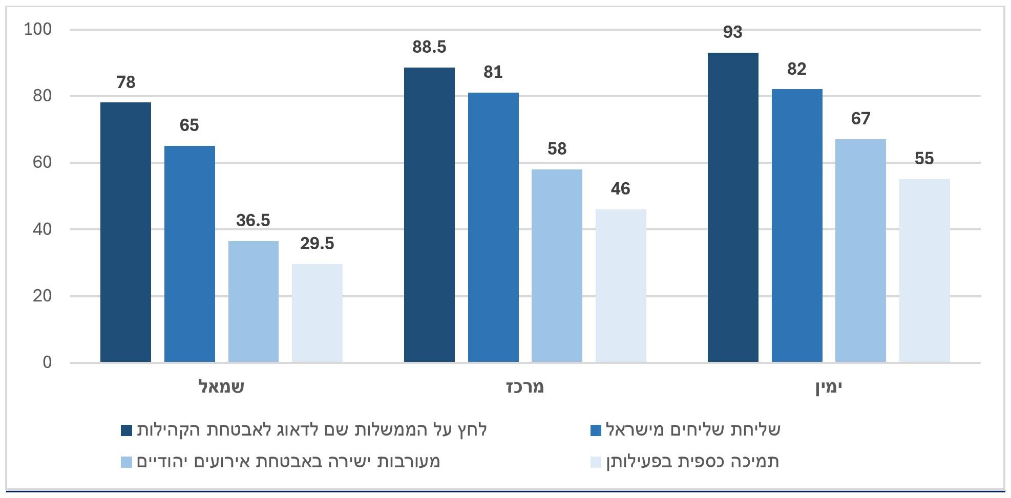 - סדר העדיפויות הזה נותר על כנו בשלושת המחנות הפוליטיים (יהודים), אם כי הפערים ביניהם ניכרים: בכל האפשרויות שיעורי התומכים בתמיכה בקהילות יהודיות בחו"ל נמוך משמעותית בשמאל בהשוואה למרכז, ועוד יותר מכך, בהשוואה לימין.