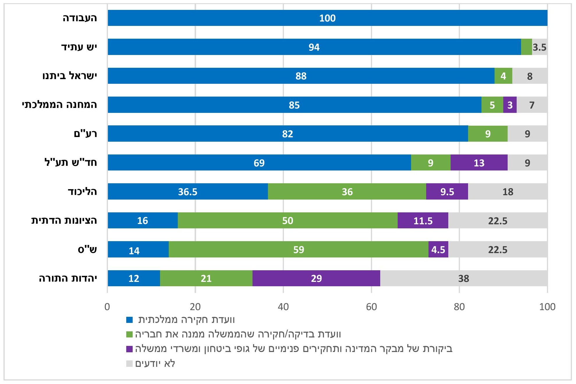 - 22% גורסים שוועדת בדיקה/חקירה שהממשלה ממנה את חבריה היא המנגנון המתאים, עלייה של 5.5% בהשוואה למדידה הקודמת ו-8.5% בהשוואה לזו שלפניה. בדומה לעבר, כיום רק 8% חושבים שיש להסתפק בביקורת של מבקר המדינה ובתחקירים פנימיים של הגופים הבטחוניים ומשרדי הממשלה.