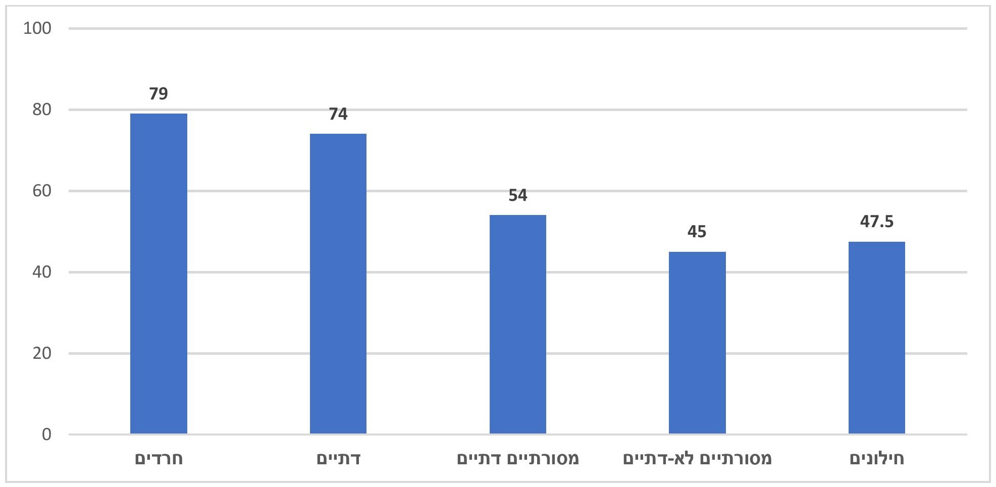 - פילוח התשובות לפי דתיות (יהודים) מעלה התפלגות דומה לשאלה קודמת. רק מיעוט בקרב החרדים והדתיים מאמינים שכך הדבר (33%, 40.5%), מחצית בקרב המסורתיים דתיים (51%), ורוב בקרב המסורתיים הלא-דתיים והחילונים (57%, 62%).