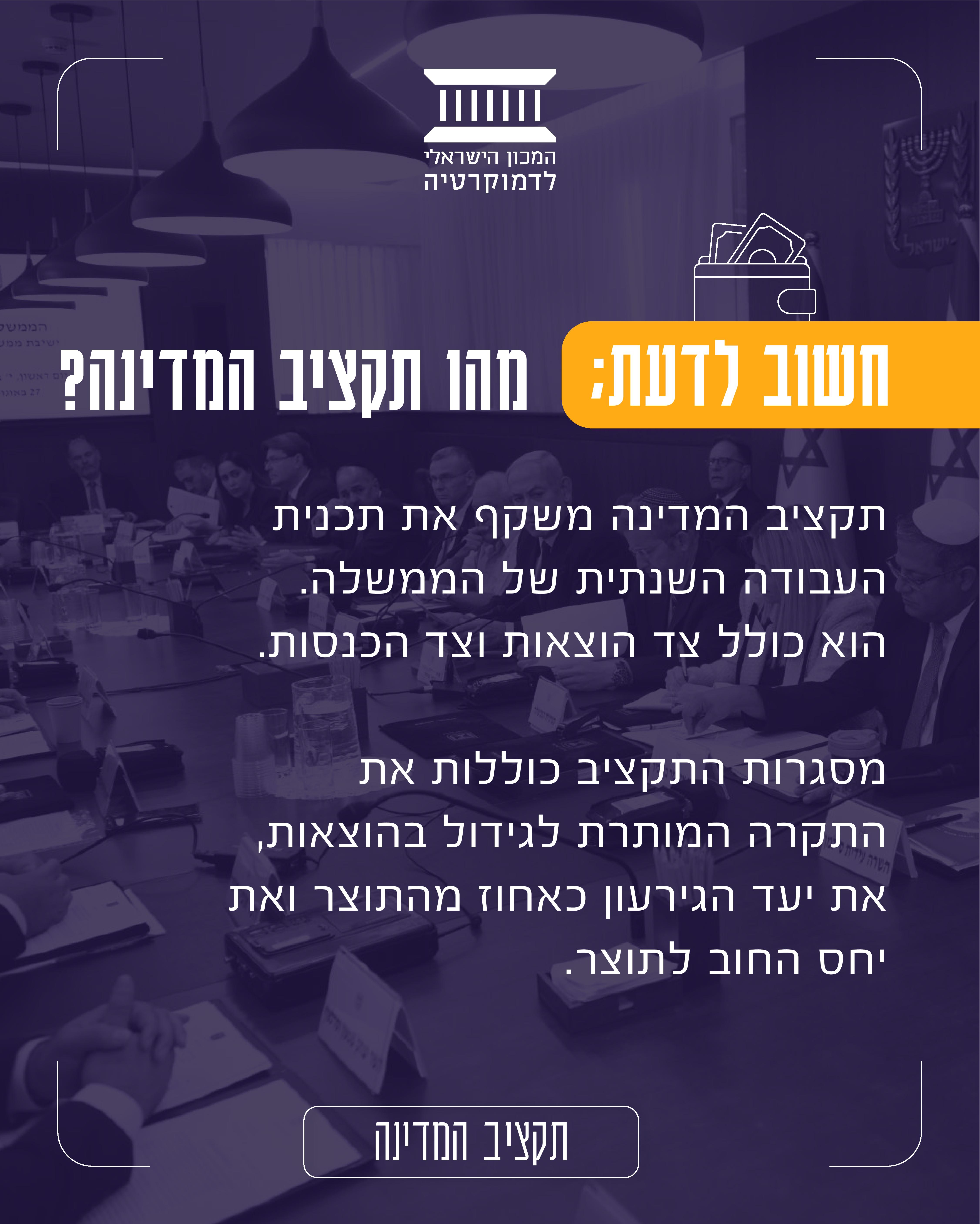 תקרת ההוצאה, יעד הגירעון ויחס החוב‑תוצר הם חלק מהמסגרת התקציבית שנקבעת בחוק התקציב עצמו, לאחר דיונים בממשלה ובכנסת.