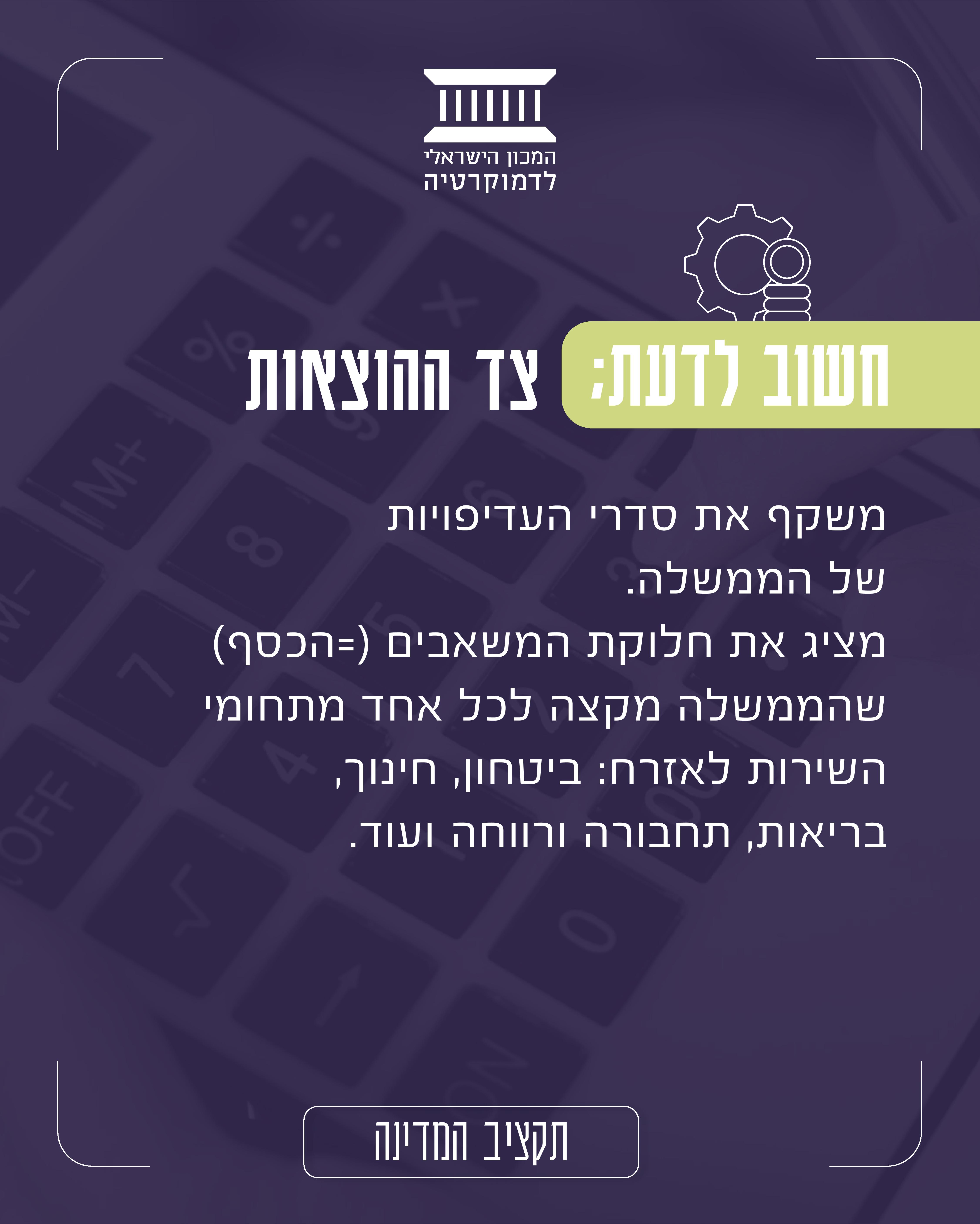 צד ההוצאות בתקציב משקף את סדרי העדיפויות של הממשלה בכך שהוא משקף מה היקף המשאבים (=הכסף) שהממשלה החליטה להקצות לטובת מתן שירותים ציבוריים לאזרח בכל אחד מתחומי האחריות של הממשלה, כגון ביטחון, חינוך, בריאות, תחבורה ורווחה ועוד.