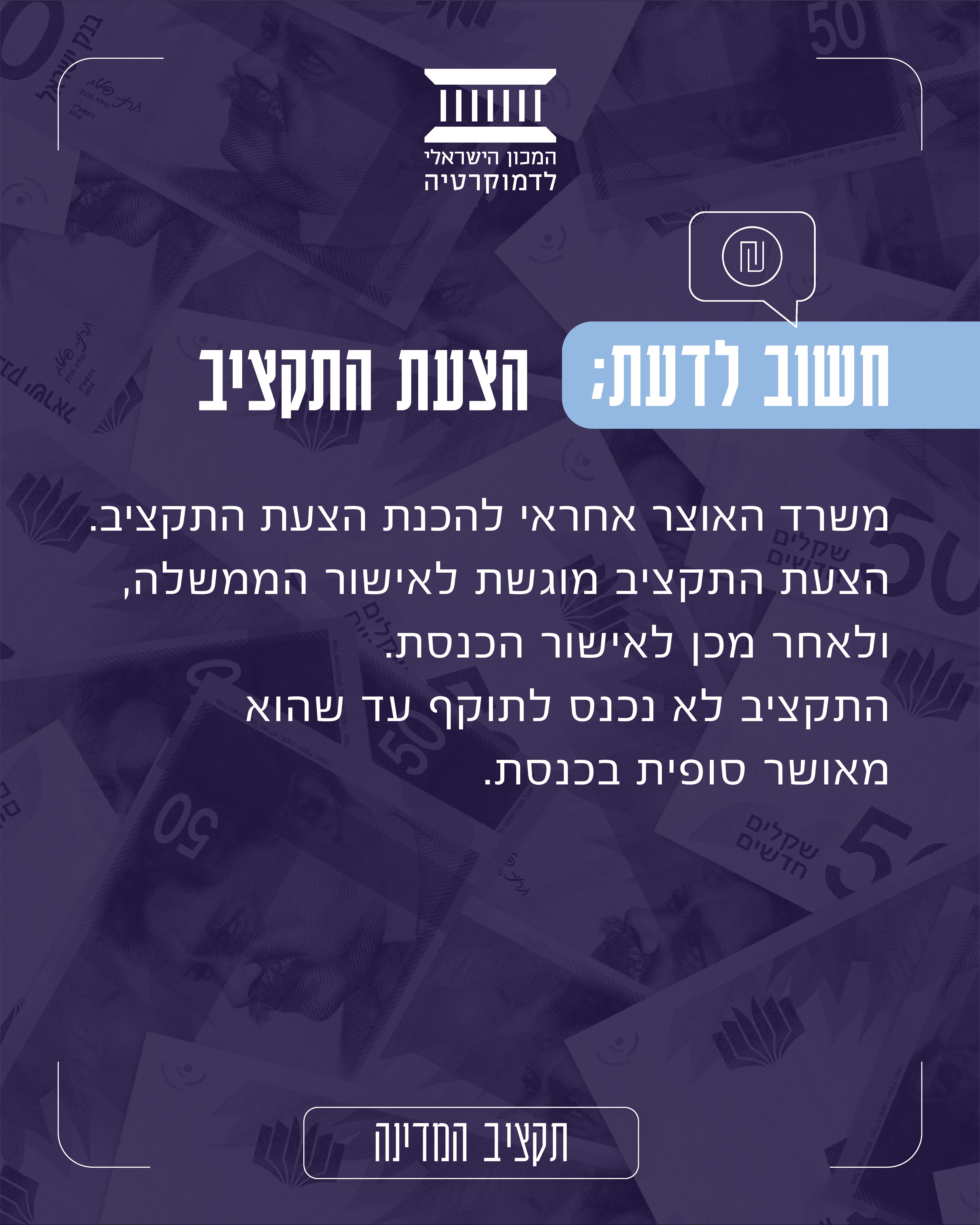 בשנת 2026 עומד היקף הצעת התקציב שתוגש לאישור הכנסת על כ- 662 מיליארד ₪. הצעת התקציב היא התוכנית שהכינה הממשלה, אך היא חייבת להתאים למסגרות התקציב שנקבעות בחוק התקציב, שנחקק בכנסת.