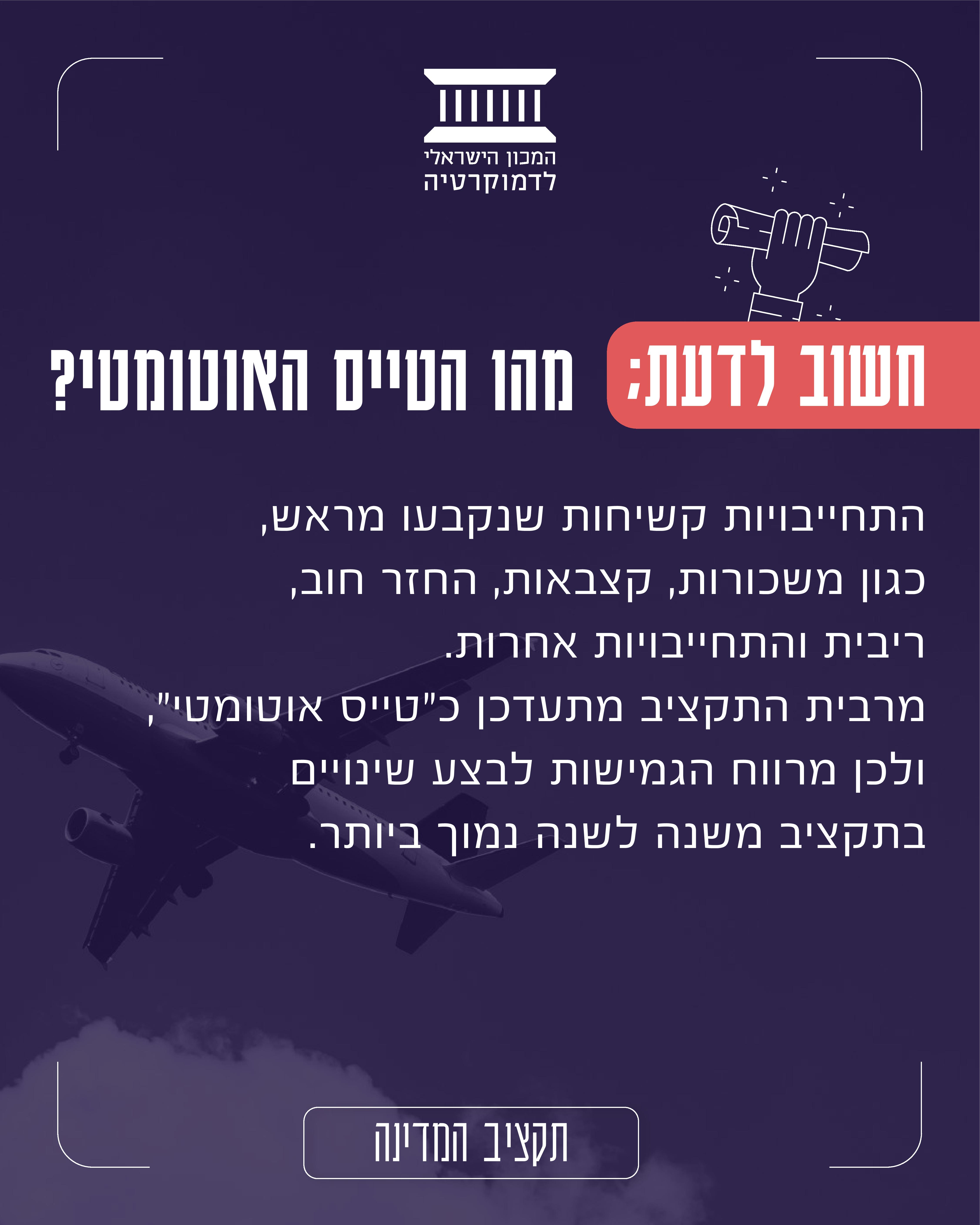 ה"טייס האוטומטי" הוא כינוי לחלק בתקציב המדינה שלגביו ההוצאות השנתיות כבר "סגורות" מראש ואינן ניתנות לשינוי בקלות. זה כולל הוצאות שכר, קצבאות לפי חוק, החזר חוב וריבית, והתחייבויות לשנים קדימה. חלק זה מהווה חלק גדול מהיקף התקציב, כך שמרבית התקציב "קבוע" מראש בשל התחייבויות קודמות. מצב זה מביא לכך שמרווח הגמישות לבצע שינויים בתקציב מדי שנה הוא נמוך ביותר ונאמד באחוזים בודדים מסך התקציב.