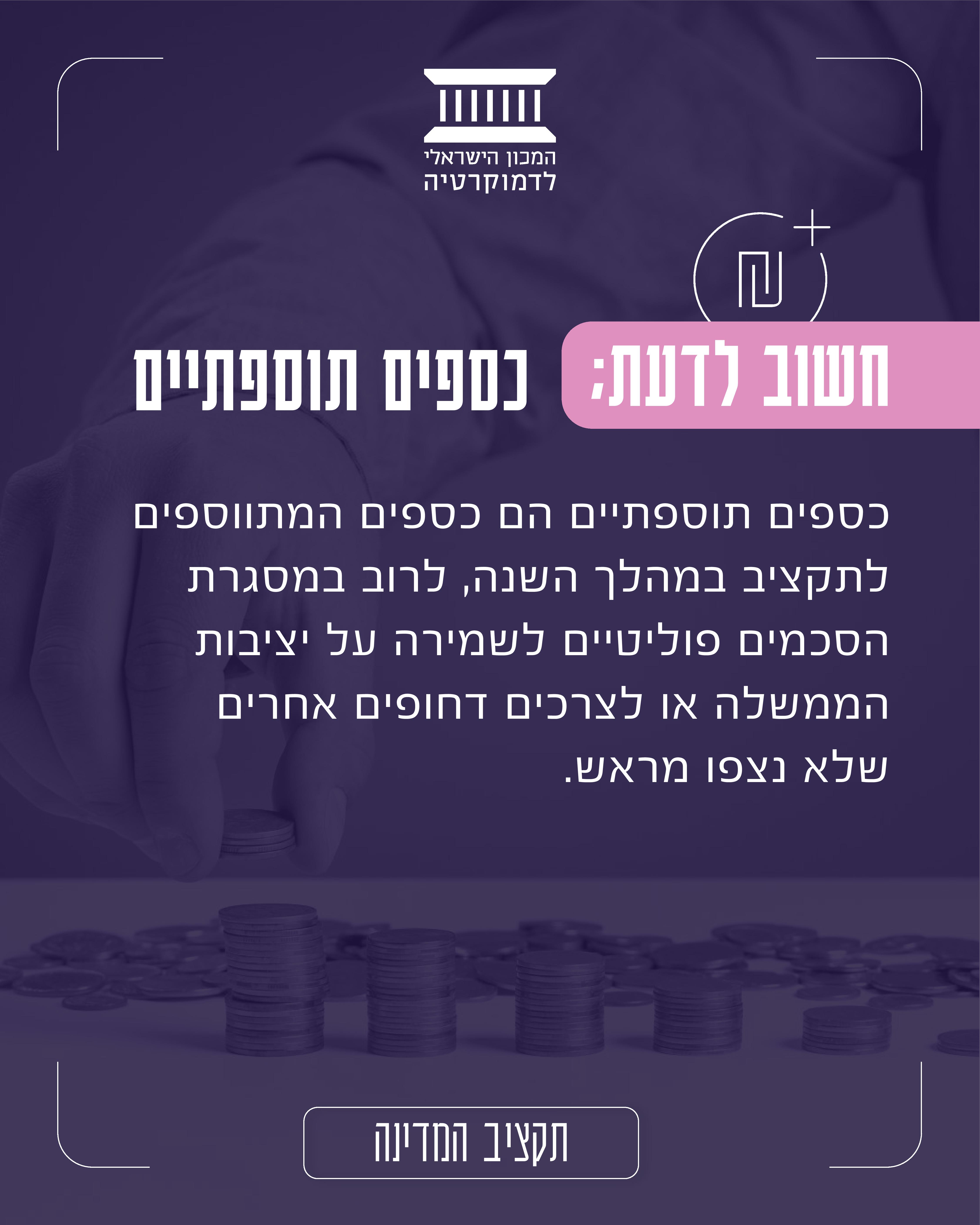 כספים תוספתיים הם כספים המתווספים לתקציב במהלך השנה, בדרך כלל עבור נושאים שלא נצפו מראש. זה יכול לכלול מימון של הוצאות ביטחון שגדלו מעבר לצפוי בשל מלחמה, הסכמים פוליטיים שונים לשמירה על יציבות הממשלה או צרכים דחופים אחרים שלא נצפו מראש בעת הכנת ואישור התקציב.
