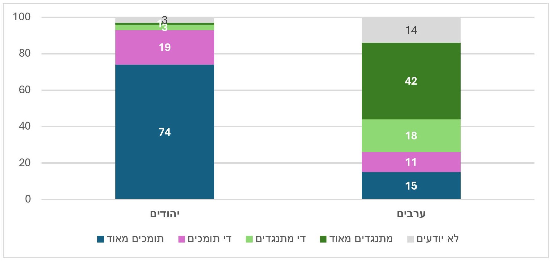 - בקרב היהודים היה רוב לסבורים שהמדינה מסוגלת לכך, ואילו בקרב הערבים השיעור הגבוה ביותר, אם כי לא הרוב, לא הסכימו אז שהמדינה ערוכה לאתגר.