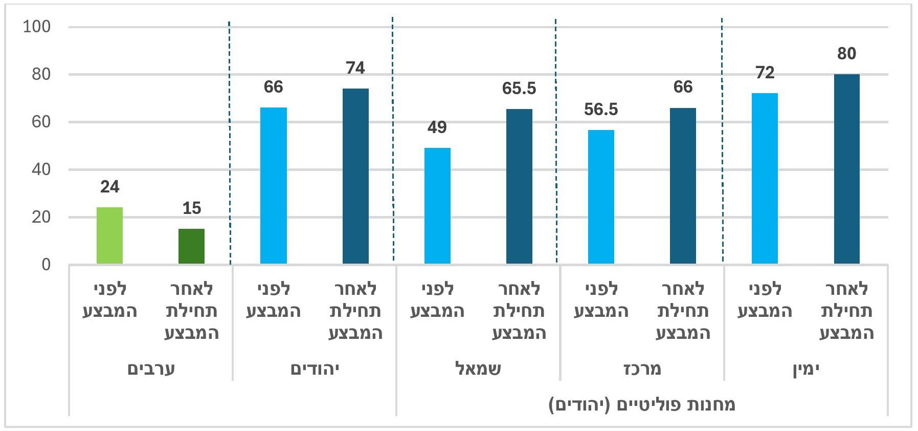 - לאחר פרוץ המבצע, רוב גדול בציבור היהודי (93%) תמכו במהלך לעומת מיעוט קטן (26%) בציבור הערבי (כלל הציבור הישראלי 82%).